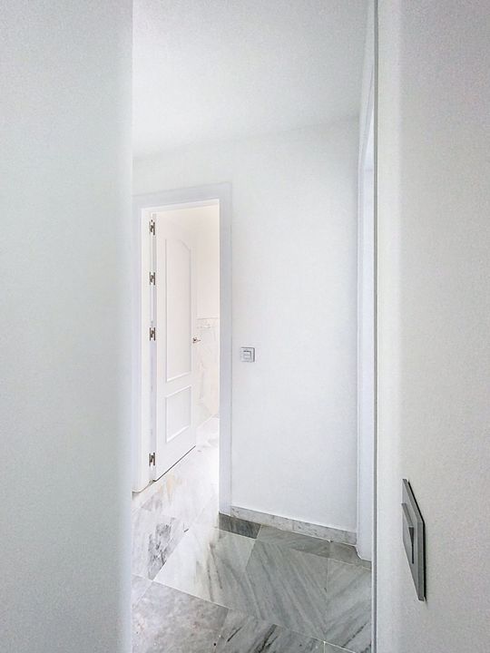 High-quality finishes include marble flooring throughout the interior, non-slip porcelain stoneware on the terraces, aluminium windows with double-glazed Climalit system, white lacquered interior carpentry and centralized hot and cold air conditioning. The apartment also includes a private underground parking space and storage room, with elevator access from the garage.