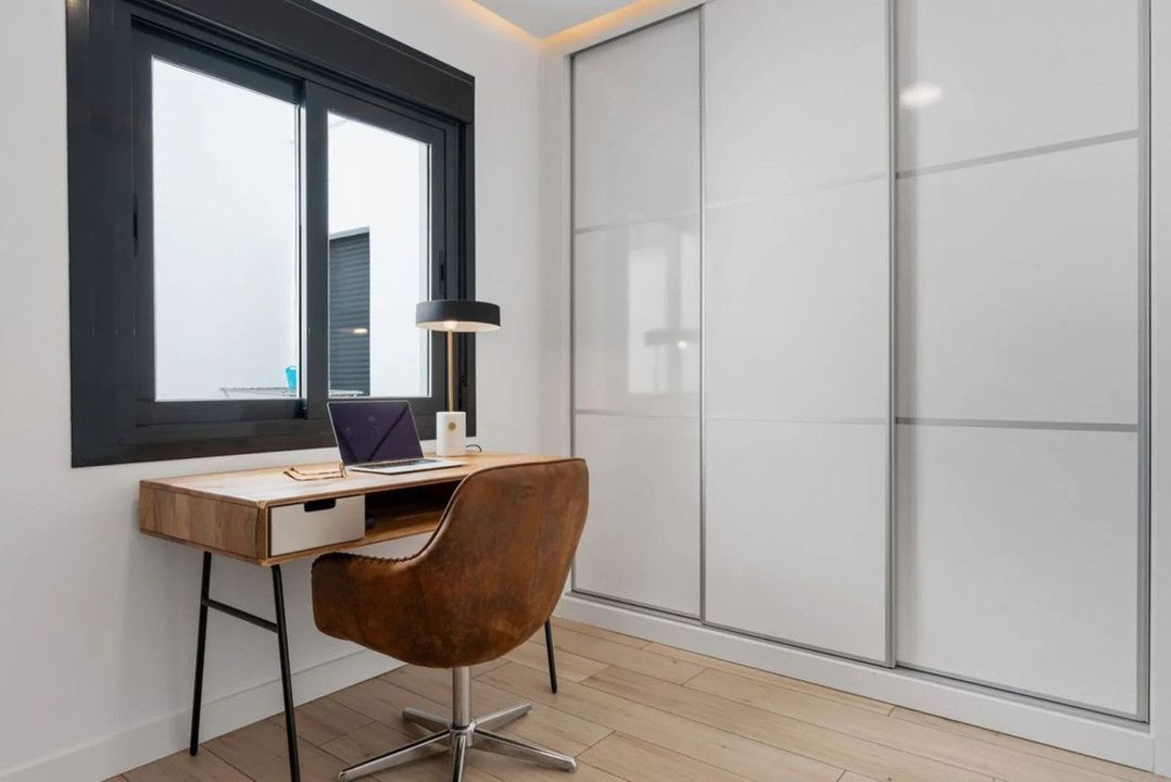 De woning telt twee slaapkamers en twee badkamers. De royale master bedroom heeft ruime inbouwkasten en een en-suite badkamer met inloopdouche, toilet en wastafel. De tweede slaapkamer is stijlvol ingericht als kantoorruimte met slaapbank – ideaal voor gasten of thuiswerken. De tweede badkamer is eveneens modern afgewerkt en voorzien van inloopdouche, toilet en wastafel.