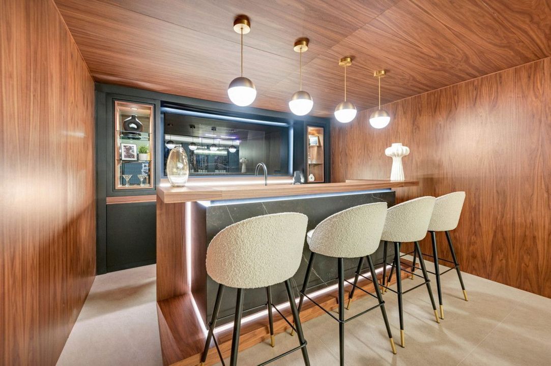 A luxury wellness and entertainment hub: cinema room, glass-fronted wine cellar, full gym, sauna, steam room, and cold plunge. A games room with designer bar, a cozy second living area, and two garden-level en-suite bedrooms create the perfect retreat. Additional features include a panic room, storage, machine room, and full underfloor heating.