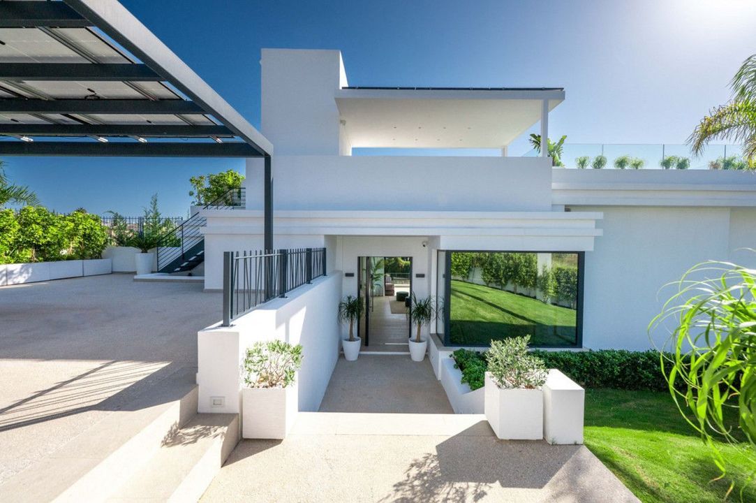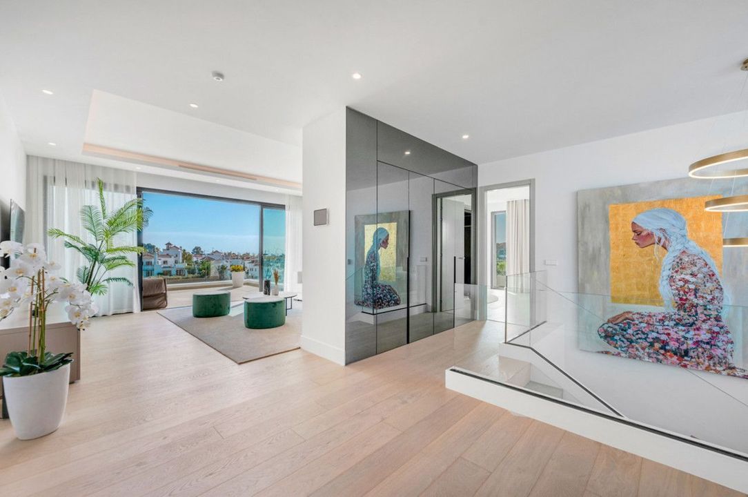 A private driveway leads to the top-floor entrance, where sweeping views of the Mediterranean and La Resina Golf Course immediately set the tone. Clean architectural lines, abundant natural light, and striking geometry create a stunning first impression.