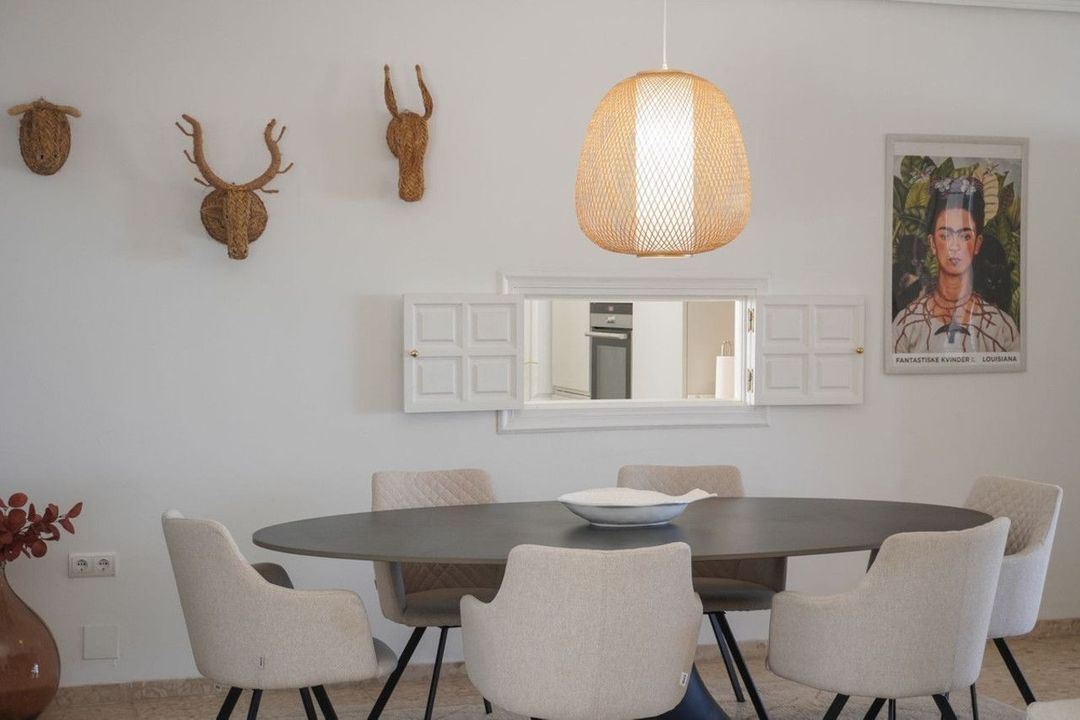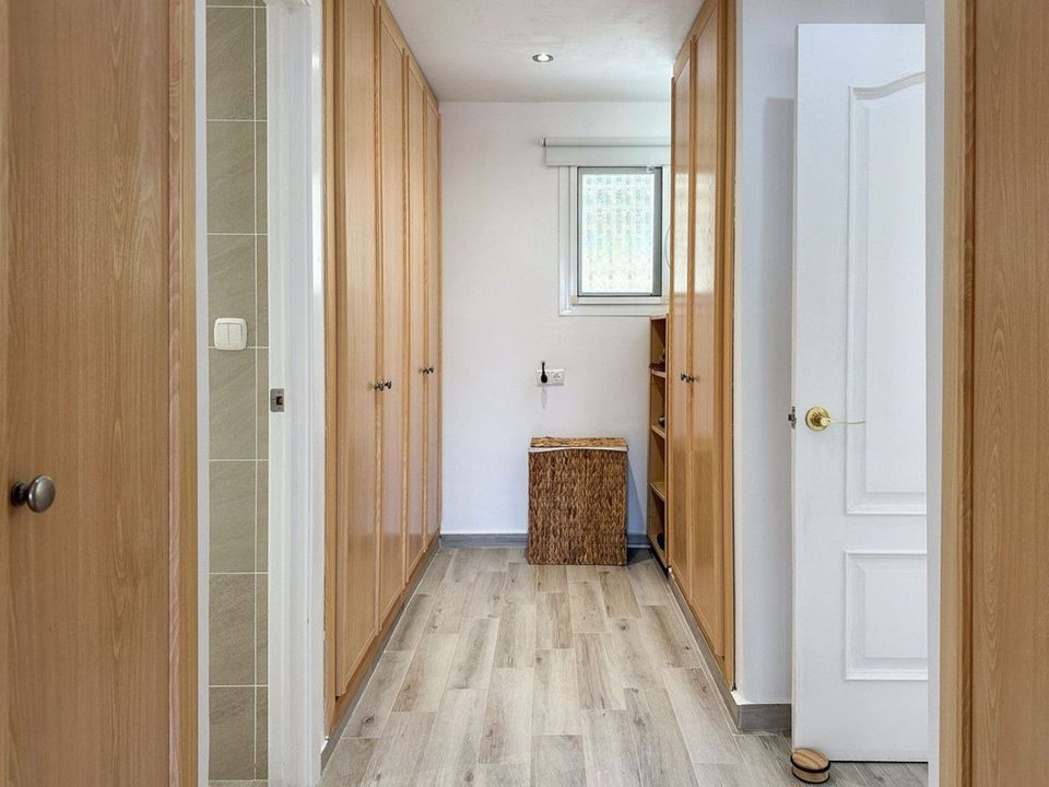 The spacious and bright living room opens onto a large terrace of 150m2 at the front of the house, where you will find a 40 m² swimming pool surrounded by plenty of space for sunbathing. From the living room there is also access to a large covered terrace of 65 m², ideal for outdoor dining, relaxing in the shade, or enjoying the mild Mediterranean climate throughout the year.