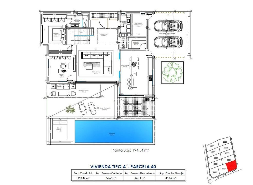 The property is built on a private plot of 1,044.54 m² and offers a total built area of 543.38 m², including 359.46 m² of interior living space.