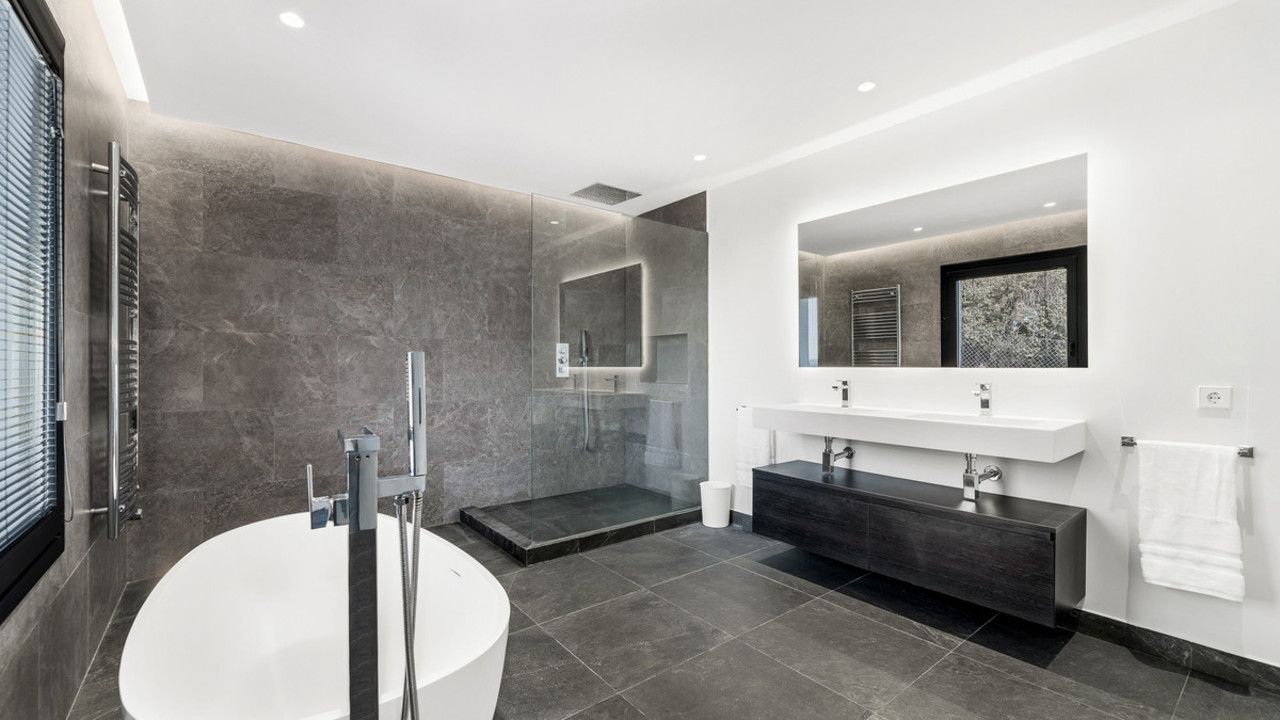 Upstairs are two generous double bedrooms and a large family bathroom. A few steps further lead to the expansive master suite occupying nearly 120 m², complete with a luxurious bathroom, walk-in wardrobe, spacious bedroom with dual aspect views, Juliet balcony, and private sun terrace.