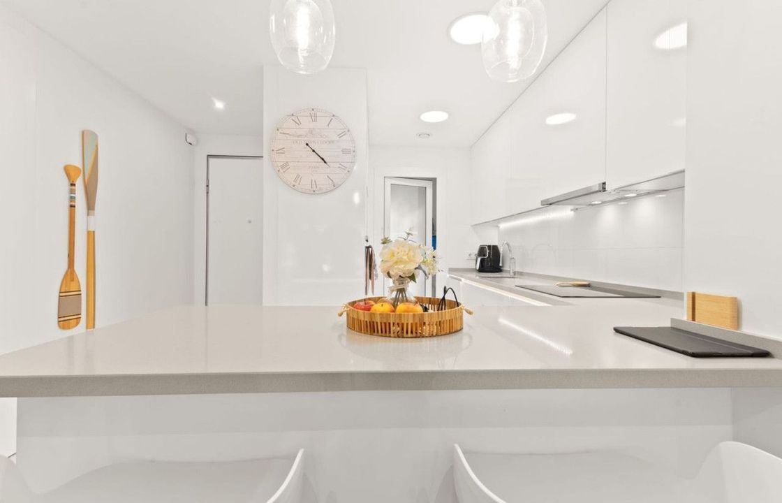 The property features a modern and functional open-plan layout, combining kitchen and living area. The fully equipped kitchen has direct access to an east-facing terrace, perfect for enjoying sunny mornings.