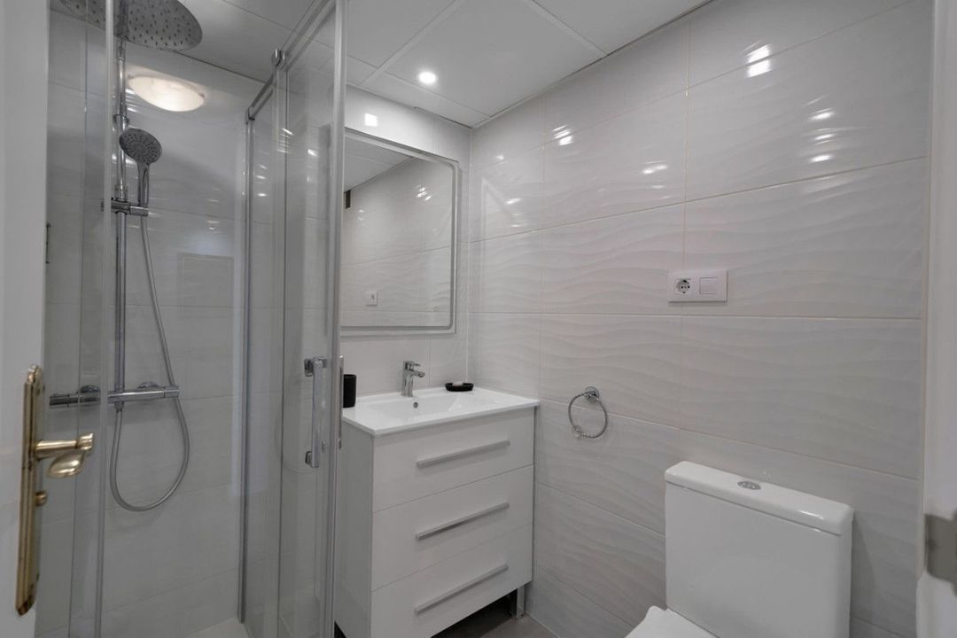 The property features two bright bedrooms, including a master bedroom with en-suite bathroom, both with large fitted wardrobes. The two bathrooms have been recently renovated, and the spacious kitchen has also been fully renovated, offering a modern and functional space with lovely mountain and green views.