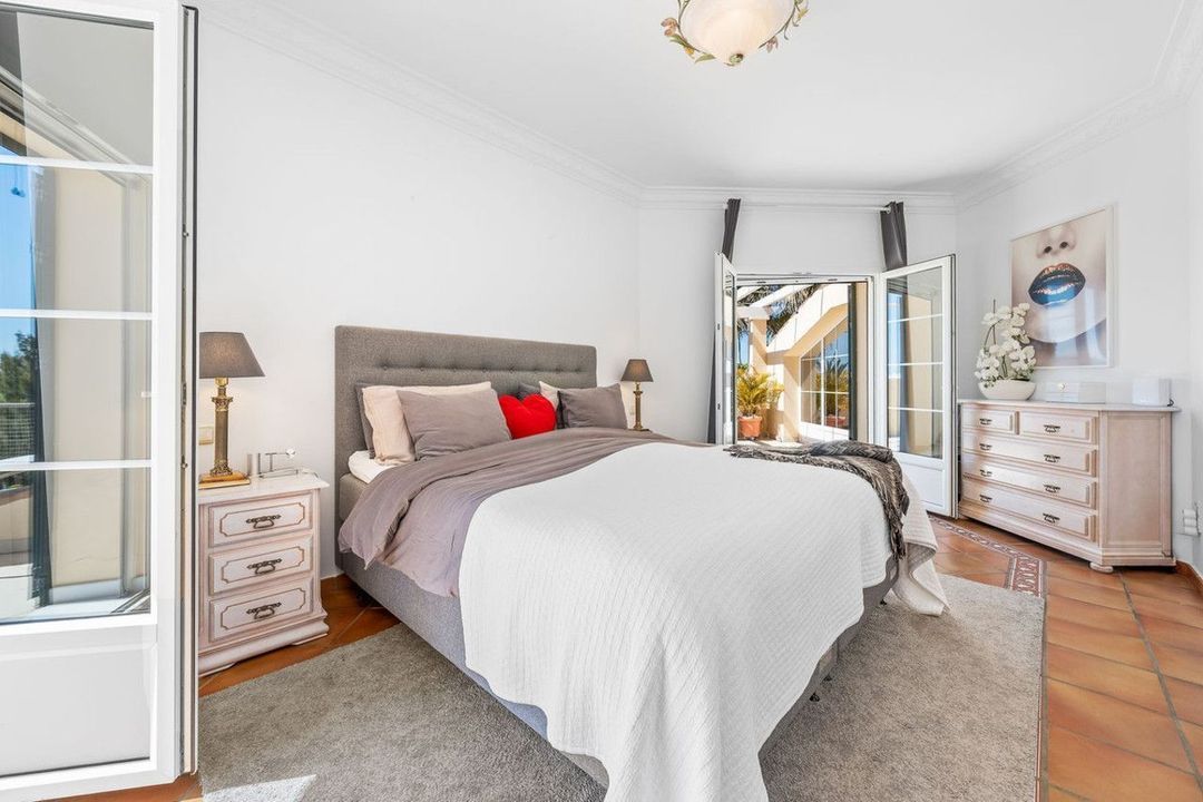 Een imposante dubbele trap leidt vanuit de centrale woonruimte naar de bovenverdieping, waar de gehele verdieping is gereserveerd voor de luxueuze hoofdslaapkamer. Dit privéverblijf beschikt over een eigen badkamer met een bubbelbad en een aparte douche, evenals een ruim terras met een adembenemend uitzicht over de kustlijn, Gibraltar en Noord-Afrika. Grenzend aan de hoofdslaapkamer biedt een ruime tv-lounge extra comfort en flexibiliteit; deze ruimte kan desgewenst worden omgebouwd tot een vierde slaapkamer.