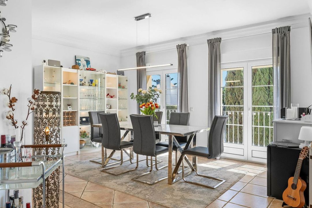 De woning is doordacht ingedeeld en ontworpen met het oog op zowel comfort als gezelligheid. Bij binnenkomst leidt een uitnodigende hal naar een ruime woonkamer, waar grote ramen naadloos aansluiten op een overdekt terras met uitzicht op het zwembad, de tuinen en de Middellandse Zee daarachter. De ruimte loopt over in een elegante eetkamer en een goed uitgeruste keuken met aangrenzende bijkeuken.