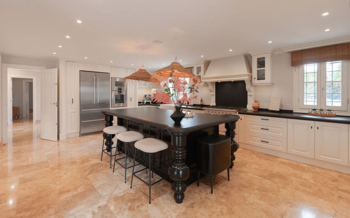A grand entrance hall with impressive high ceilings and two bespoke wine cellars sets an elegant tone upon arrival. This leads into a spectacular 50 m² fully fitted designer kitchen, equipped with two premium Gaggenau appliances, including four ovens in the kitchen, and a charming dining area with a fireplace—perfect for hosting unforgettable gatherings. A separate back kitchen with laundry room adds practicality.