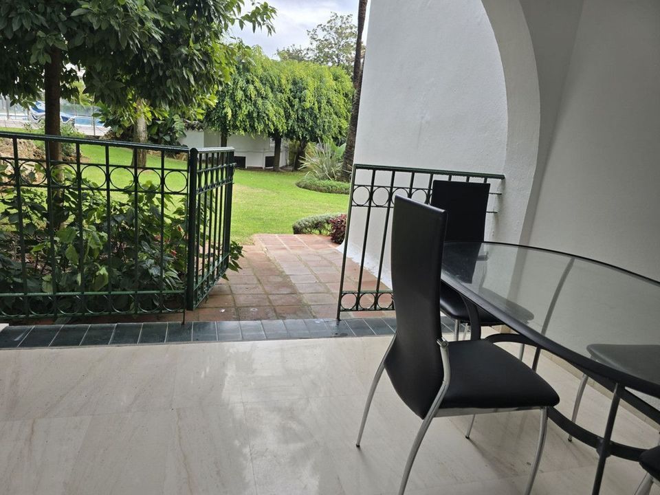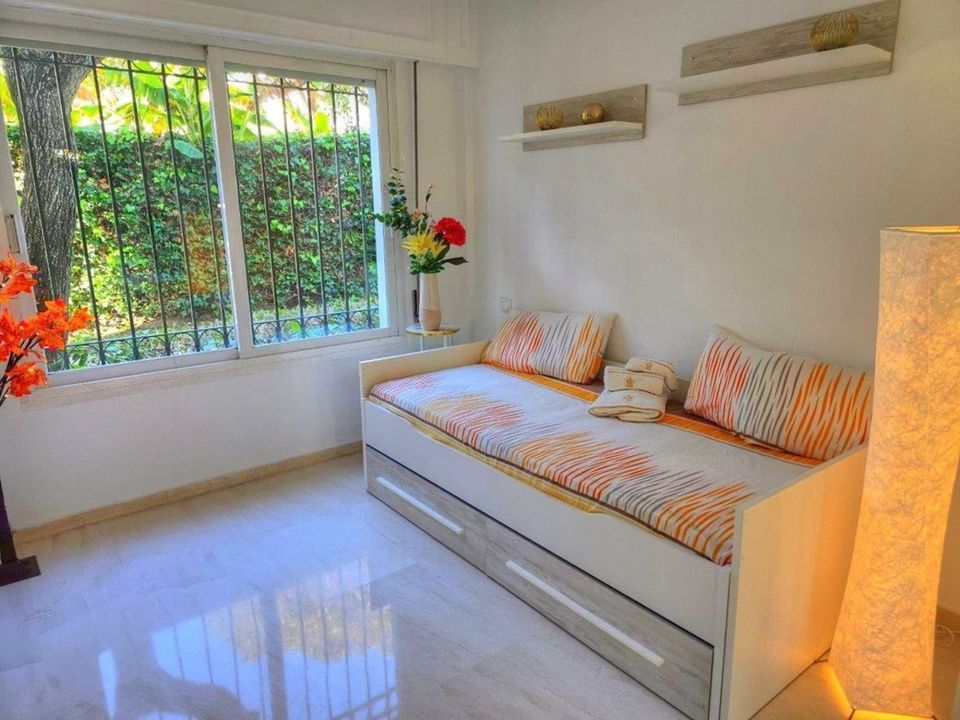 2 bedrooms, 1 bathroom, 1 salon with dining area, 1 american kitchen, great terrace with garden views and direct access to garden, pool and beach.