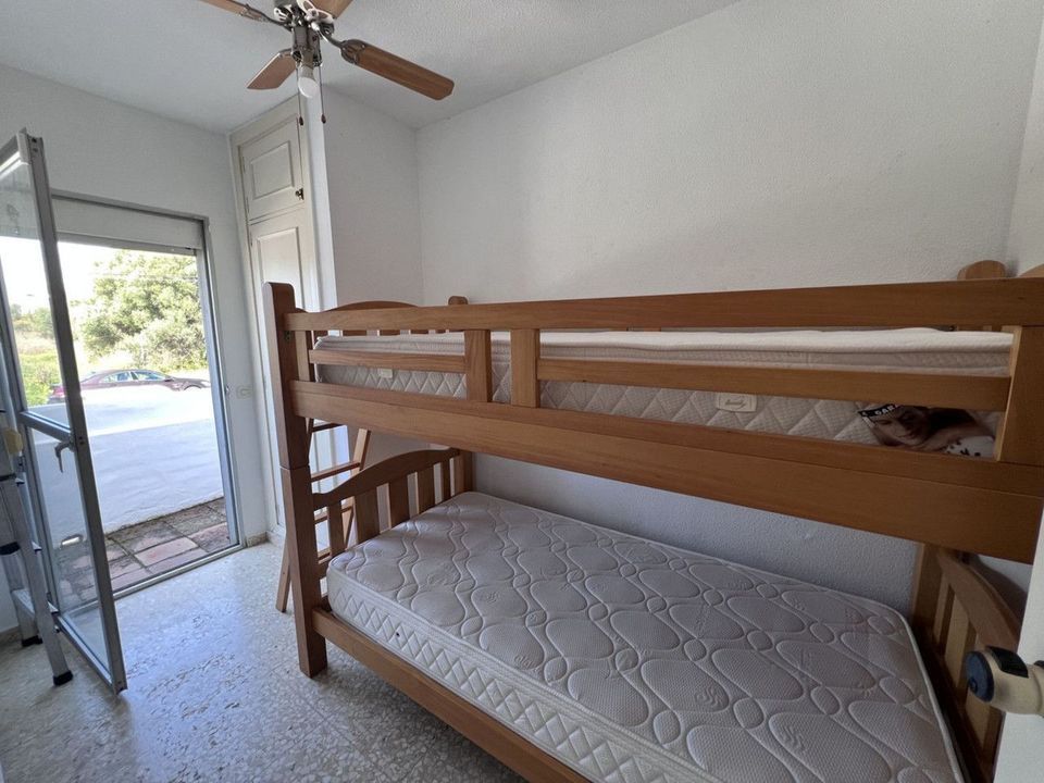 From the dining area, patio doors lead out to a private west-facing patio garden, ideal for enjoying the afternoon and evening sun. To the front, a smaller east-facing terrace provides a lovely spot to relax in the morning sunshine while taking in views of the community gardens, pool area, and La Concha mountain beyond.