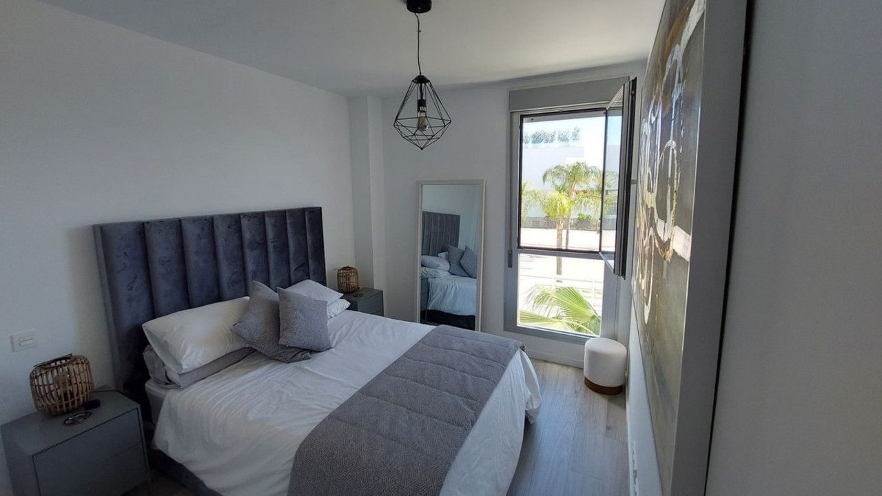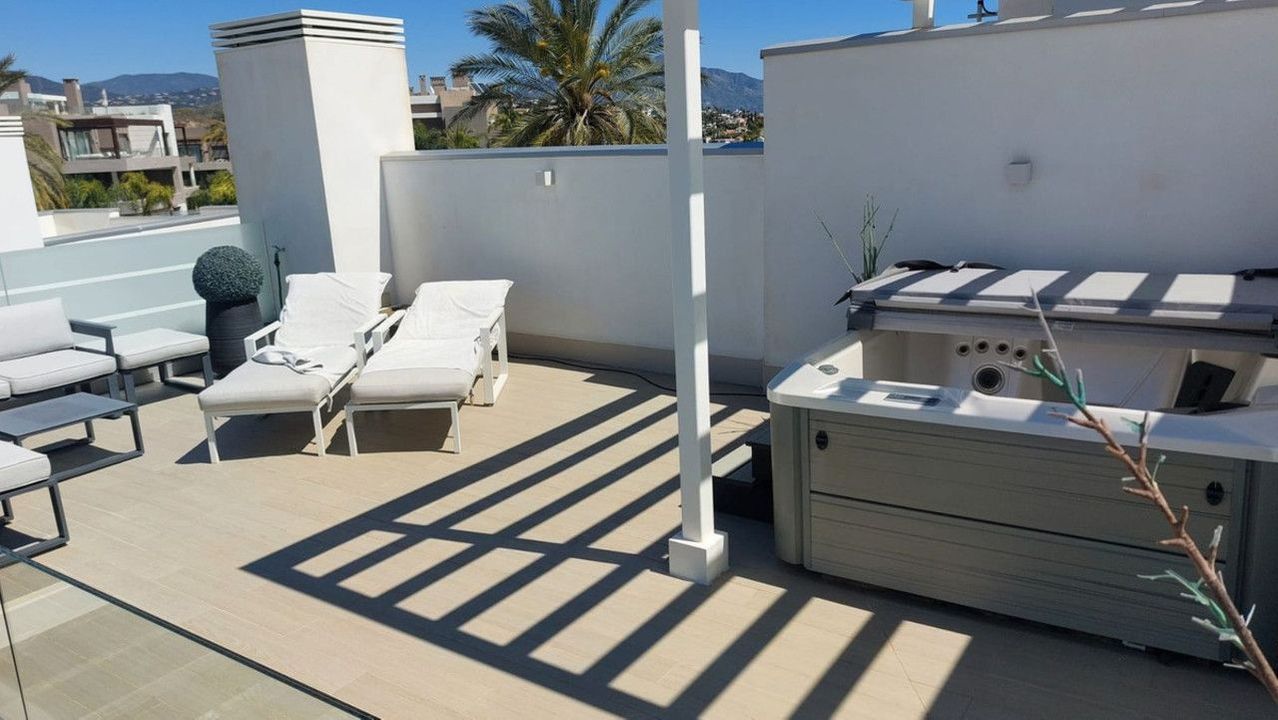 A staircase leads to the 35 m² rooftop solarium, which enjoys all-day sun and uninterrupted panoramic views extending to Gibraltar and the African coastline. The terrace orientation ensures sun from midday through to sunset.