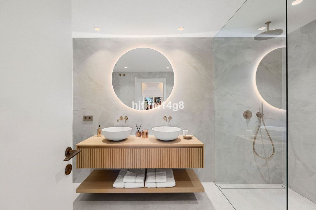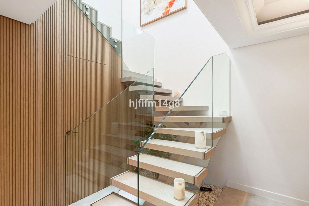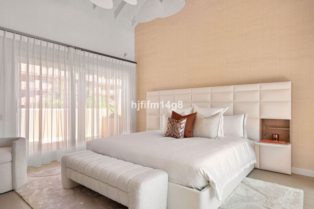 The upper level is dedicated to the impressive master suite, designed as a private sanctuary. It features a walk-in wardrobe, a luxurious en-suite bathroom, and access to its own south-facing terrace. This upper terrace offers both shaded and open-air spaces, a built-in barbecue, and breathtaking views of the Mediterranean Sea and the beautifully landscaped grounds of Torre Bermeja, making it perfect for enjoying the year-round climate of Estepona.