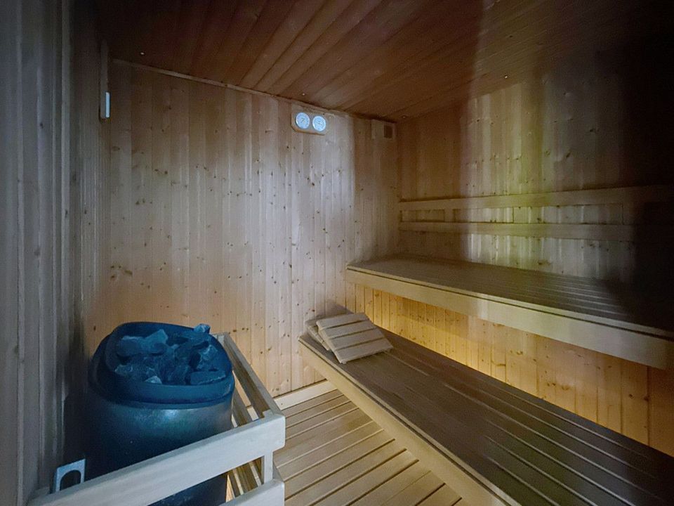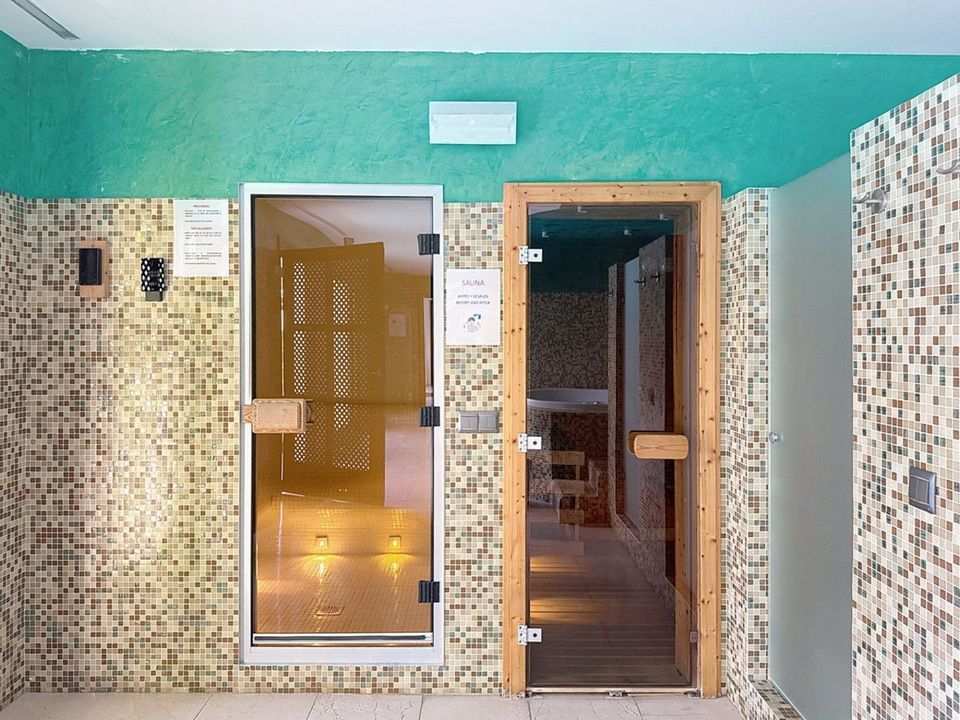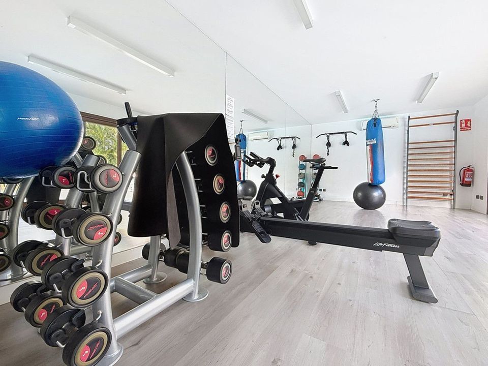 Within the gated community, residents enjoy exclusive resort-style amenities — a swimming pool overlooking the sea, a fully equipped gym, a wellness area with sauna and jacuzzi, and direct beach access. The property also includes private parking and a large storage room for convenience.