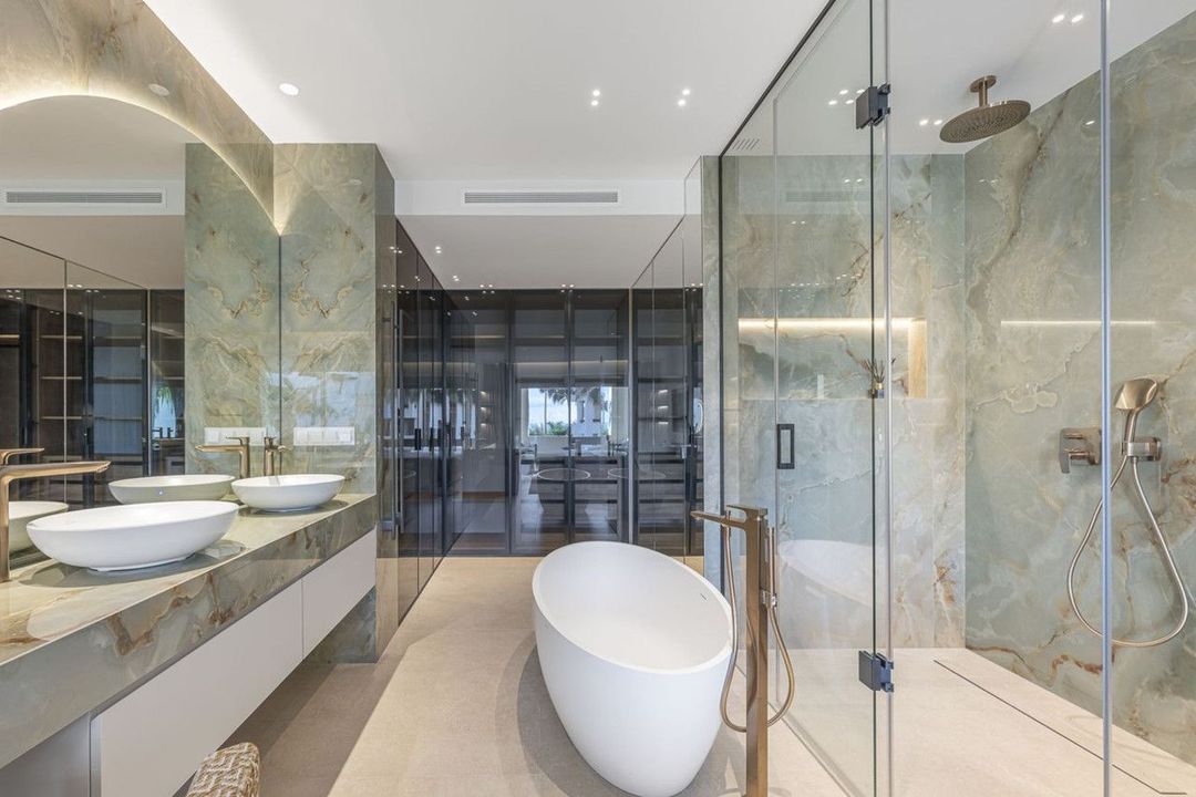 De woonruimte loopt door naar een royaal privéterras van 23 vierkante meter, waar het panoramische uitzicht op de zee en de zorgvuldig onderhouden tropische tuinen een werkelijk betoverende achtergrond vormt. Vanaf hier is er directe toegang tot de strandpromenade, de perfecte plek voor ontspannen wandelingen langs de kust of een verfrissende duik in de Middellandse Zee. De woning beschikt bovendien over twee ondergrondse parkeerplaatsen en twee privé-opslagruimtes, wat zorgt voor zowel gemak als praktische bruikbaarheid.