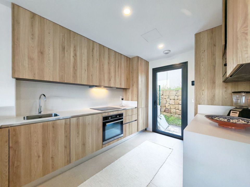 Half Vrijstaande Villa te koop in , Estepona met 3 slaapkamers, 2 badkamers, 1 badkamer, 1 toilet en met oriëntatie zuid-west, met gemeenschappelijk zwembad, privé garage (1 parkeerplaatsen) en privé tuin. Over eigendom afmetingen heeft 123,65 m² bebouwd, 206,84 m² plot, 101,45 m² interieur en 44 m² terras. Over de volgende faciliteiten vervoer dichtbij, airconditioning, inbouwkeuken, gasten slaapkamer, ingang beveiliging, dubbele ramen, video ingang, nieuw, gastentoilet, privé terras, woonkamer, uitzicht over land, uitzicht op de bergen, vloerverwarming (overal), beveiliging rolluiken, overdekt terras, elektrische rolluiken, inbouwkasten, uitzicht op de tuin, dicht bij speeltuin, dicht bij golfclub, niet overdekt terras, glazen deuren, open keuken, balkon, meubels optioneel, plafond koelsysteem, dicht bij winkels, dicht bij scholen, binnen golf resort en huisdieren toegestaan.