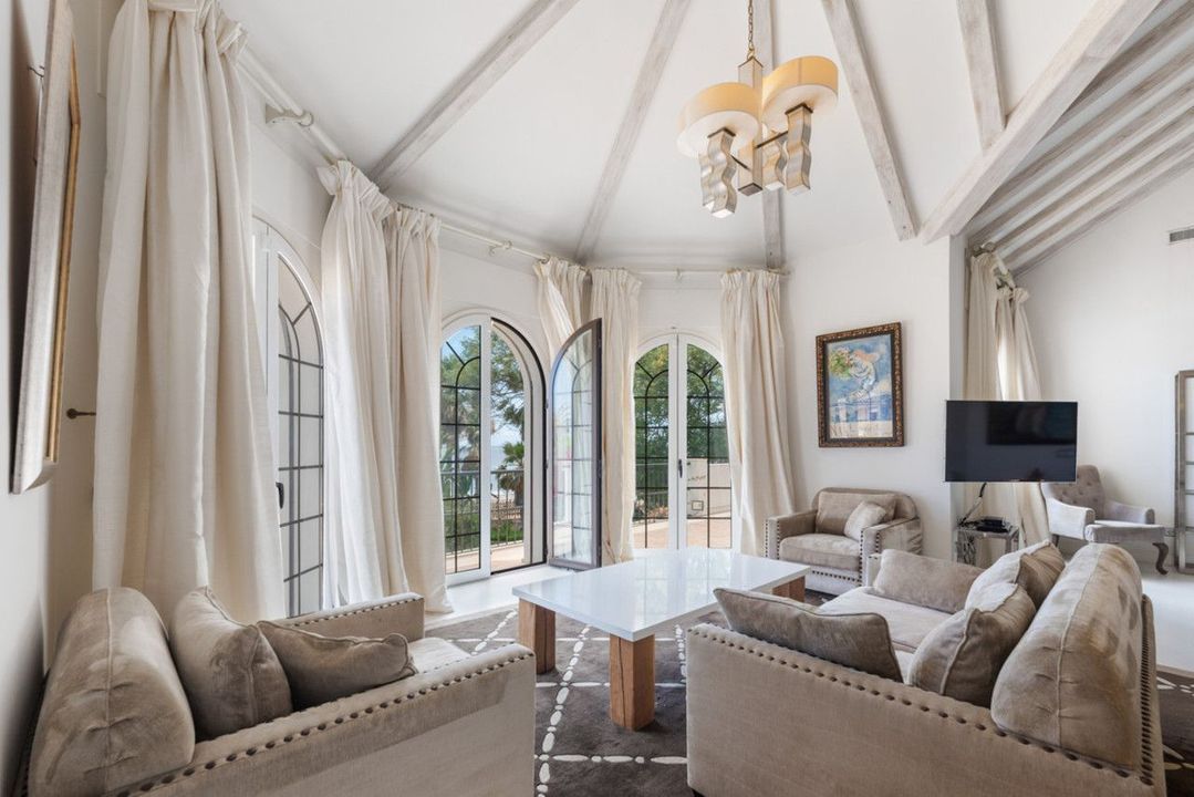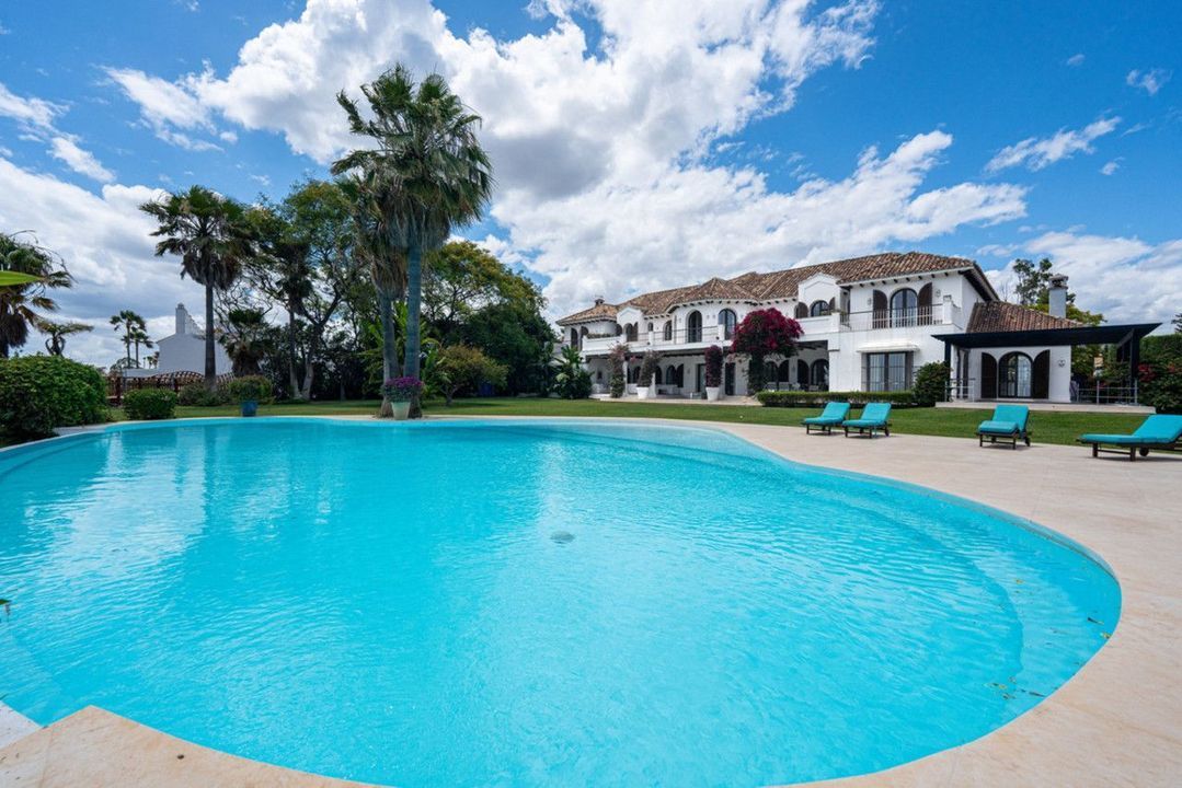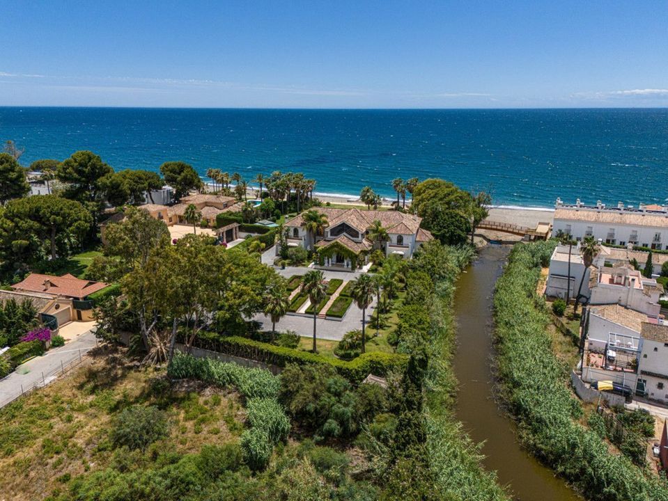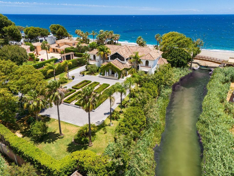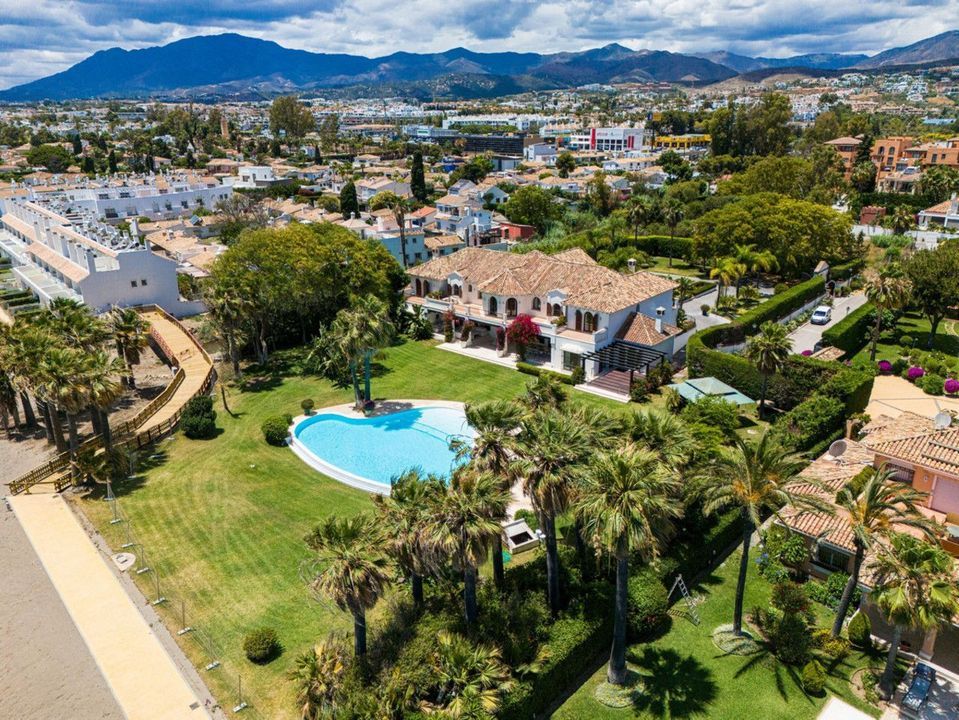 Villa Alcazar is a grand beachfront mansion on the New Golden Mile in Estepona. The villa sits frontline to the sea with direct beach access and panoramic Mediterranean views. This luxury property offers expansive living areas, seven bedrooms, elegant terraces and beautifully landscaped gardens designed for privacy and comfort.