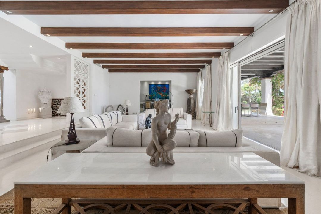 The villa opens with a dramatic double height entrance hall with wooden beams and a statement chandelier. Two elegant living rooms lead to a large covered terrace facing the sea. The property includes a formal dining room and a bright modern kitchen with a central island. The ground floor also features two ensuite bedrooms with marble bathrooms.