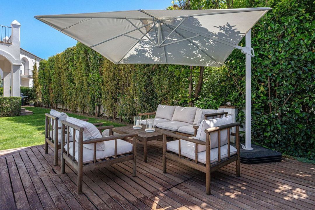 Outside, a private and fully enclosed garden offers a swimming pool, sun deck, and a covered terrace that extends the living space outdoors. It's a peaceful setting designed for both relaxation and easy entertaining in a green, quiet environment.