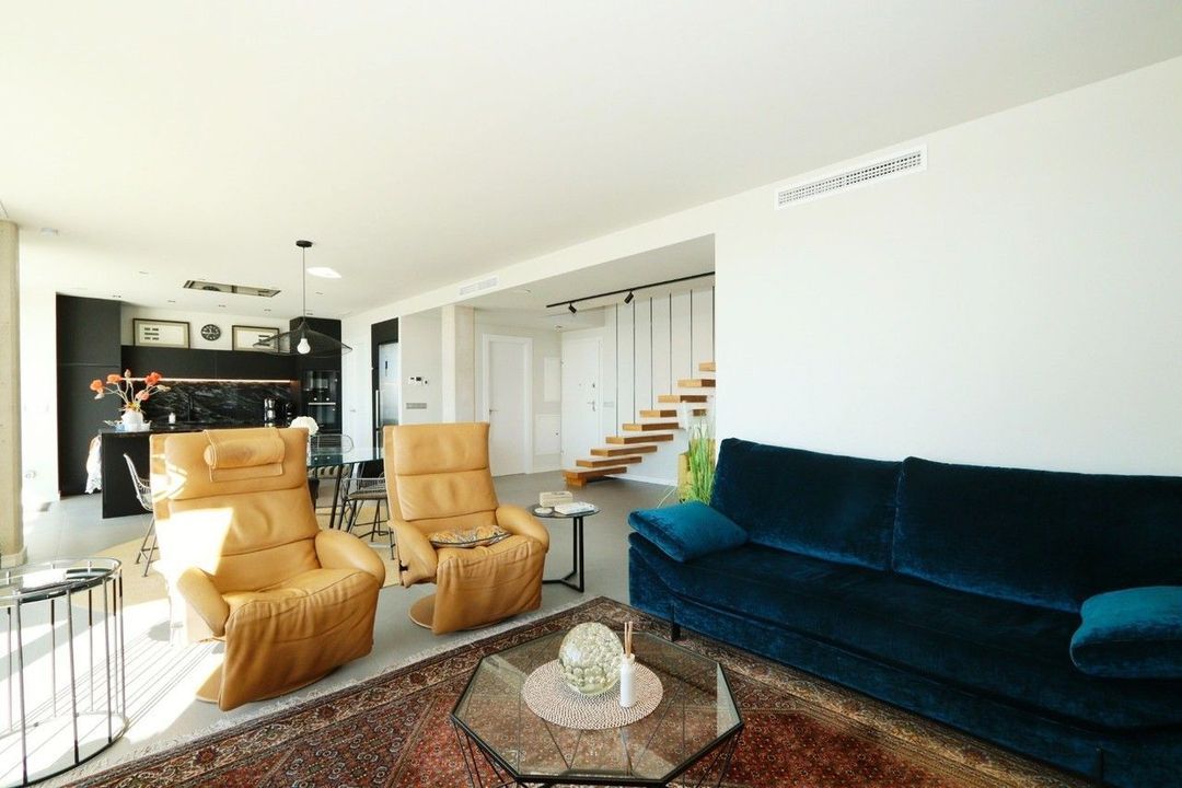 Het interieur kenmerkt zich door ruime en lichte leefruimtes, met een elegante woon- en eetkamer die naadloos overgaat in de buitenruimtes. De open designkeuken met kookeiland is volledig uitgerust en combineert functionaliteit met stijl. De woning beschikt over drie ruime slaapkamers, elk met een eigen en-suite badkamer, evenals een gastentoilet op de begane grond, wat het totaal op vier badkamers brengt. Hoogwaardige afwerkingen zijn overal aanwezig, waaronder airconditioning via kanalen, vloerverwarming, dubbele beglazing, elektrische rolluiken, moderne verlichting en een aparte wasruimte. Dankzij het energielabel A staat de woning garant voor duurzaamheid en efficiëntie.