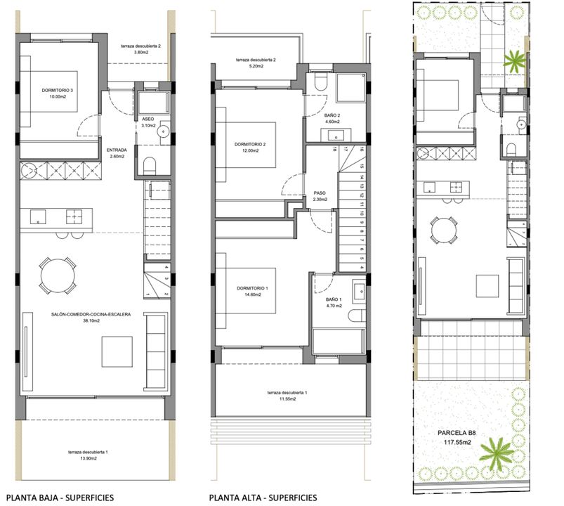 Op de begane grond bevinden zich de woon-eetkamer, een open keuken met Bosch apparatuur of gelijkwaardig, een slaapkamer en een badkamer. Via de interne trap bereikt u de bovenverdieping met twee slaapkamers, elk met en-suite badkamer en een eigen terras.