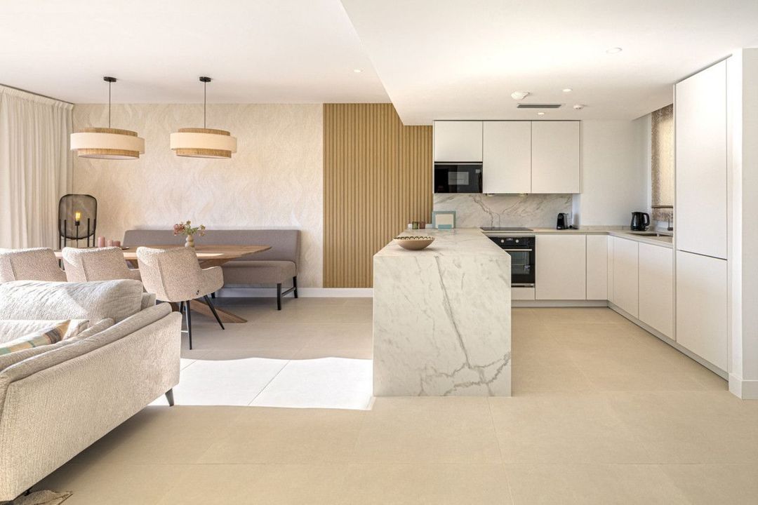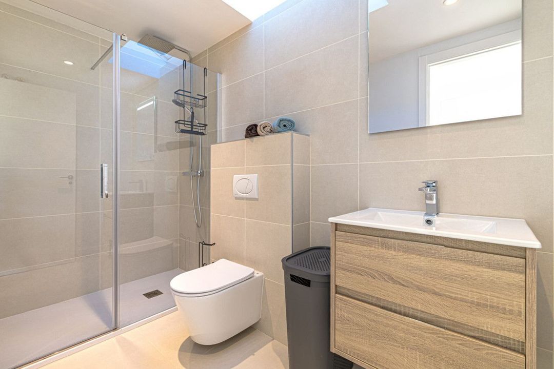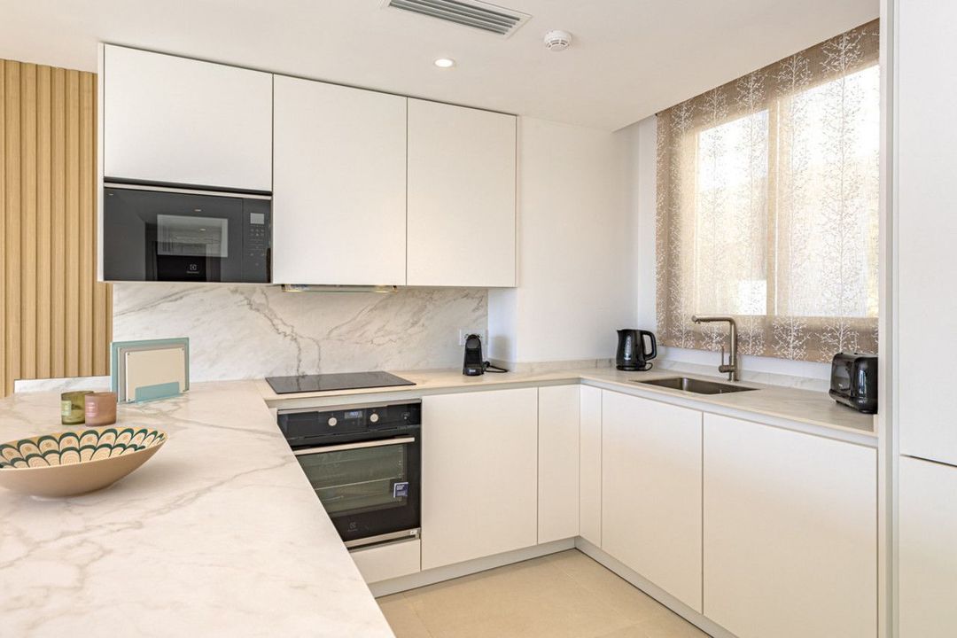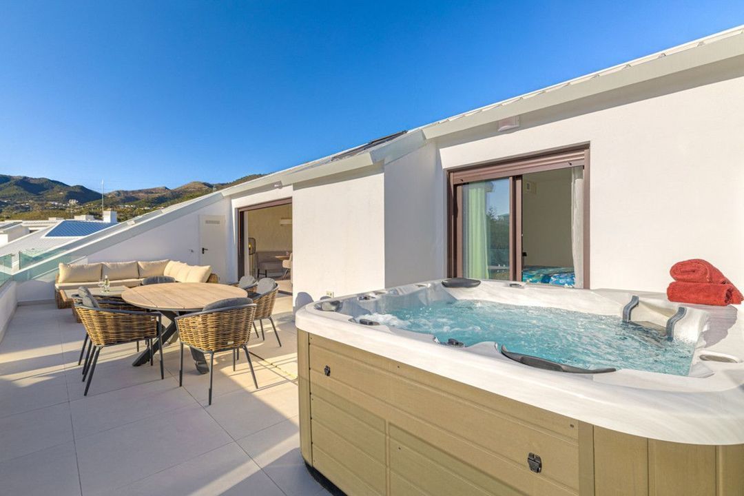 This elegant property offers 2 spacious bedrooms and 2 beautifully designed modern bathrooms, created with comfort and refined contemporary living in mind. The bright open-plan living space is flooded with natural light and flows seamlessly onto an impressive 50 m² private terrace, undoubtedly one of the home's standout features. Here, you will find a luxurious jacuzzi, creating the perfect setting to unwind while enjoying breathtaking sunsets and partial sea views thanks to its privileged southwest orientation.