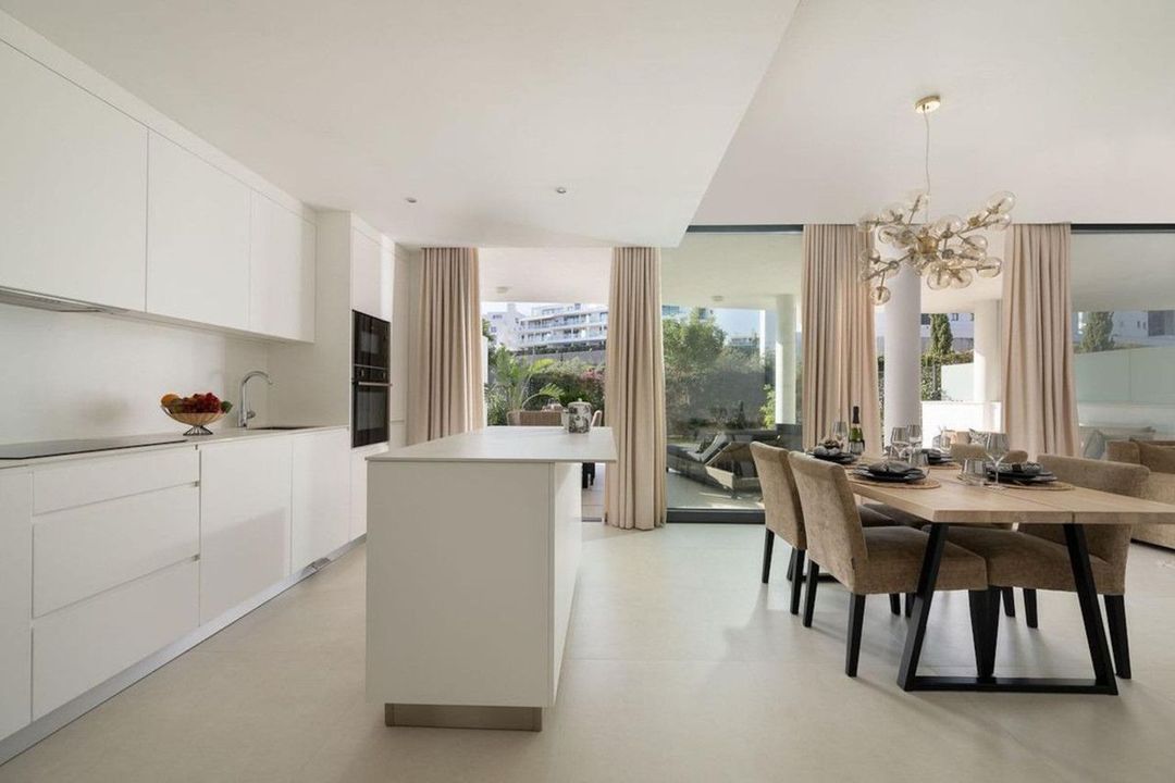 The property features a spacious open-plan living and dining area with floor-to-ceiling sliding doors that seamlessly connect the interior to a private landscaped garden, creating an ideal space for relaxation and entertaining. The modern kitchen is fully equipped with high-end appliances and sleek finishes, perfectly complementing the apartment's elegant aesthetic.