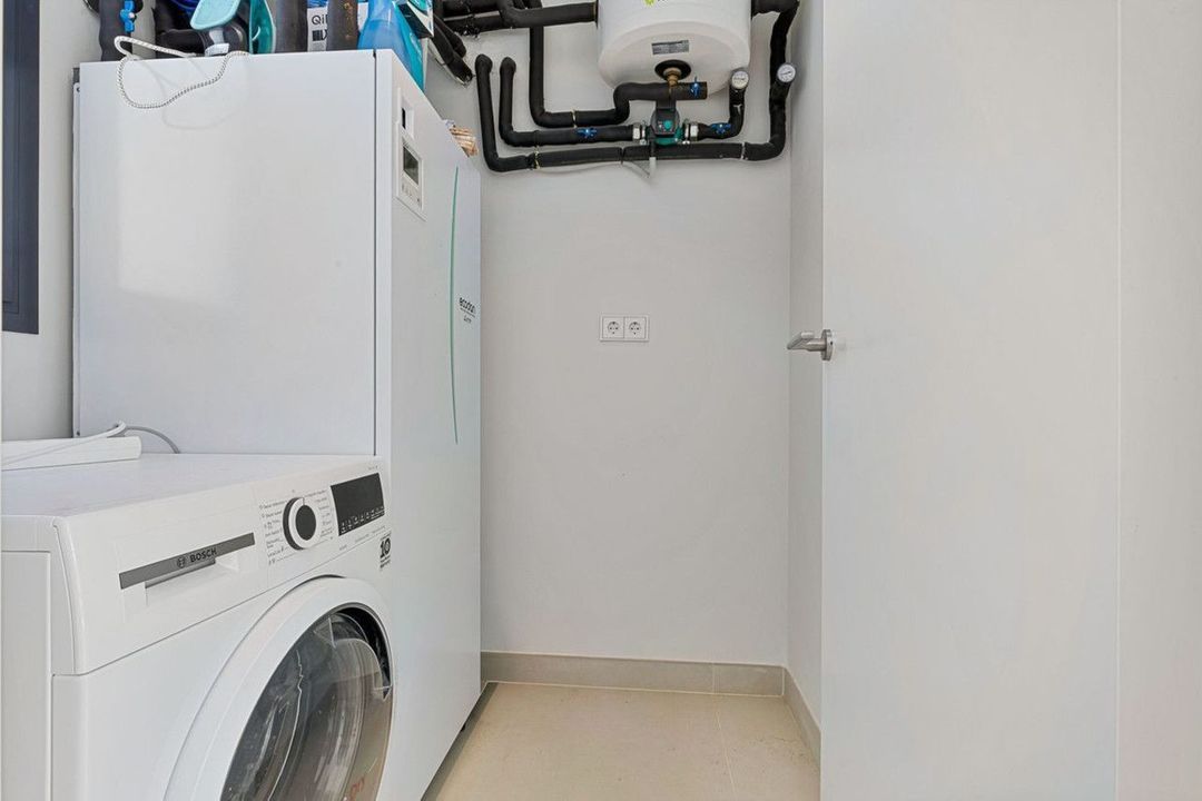 The bright living room opens seamlessly onto an impressive 103.60 m² private rooftop terrace — a true Mediterranean retreat. Here you will find a heated private swimming pool, sun loungers, a stylish lounge area, and an outdoor dining space. This is the perfect setting to enjoy both sunrise and sunset in complete privacy. Additionally, the apartment features a smaller 12 m² balcony.