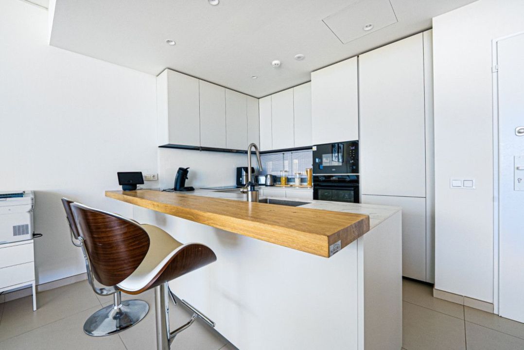 Apartment West is a ground-floor luxury home with uninterrupted sea views that stretch across the horizon. The open-plan living area is filled with natural light through floor-to-ceiling terrace doors. The kitchen features marble countertops, sleek neutral cabinetry, and stainless-steel appliances, offering a modern and elegant finish.