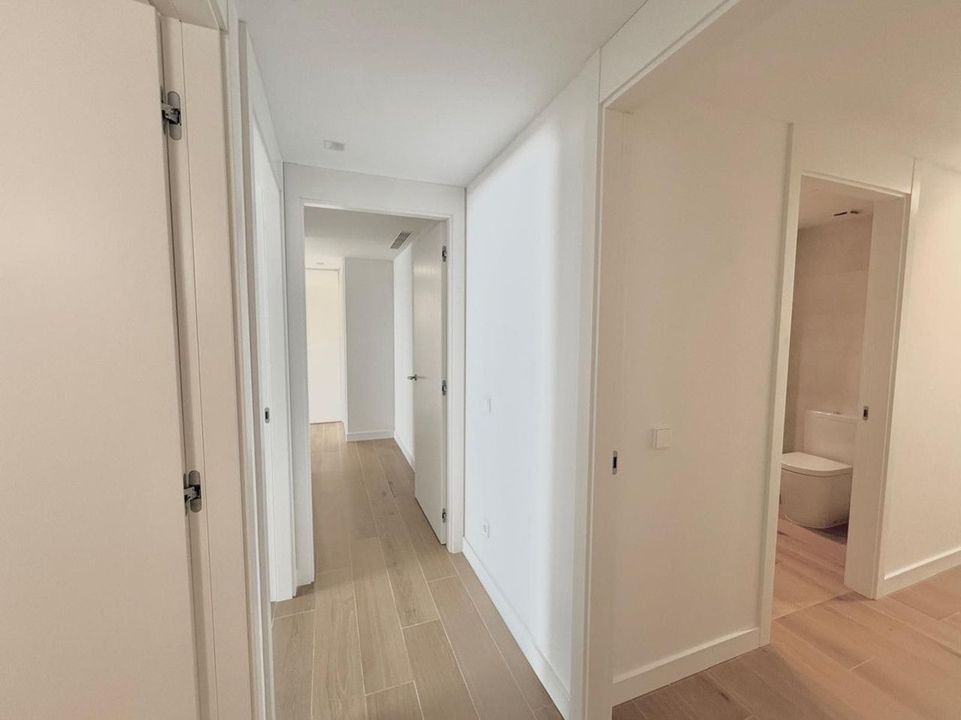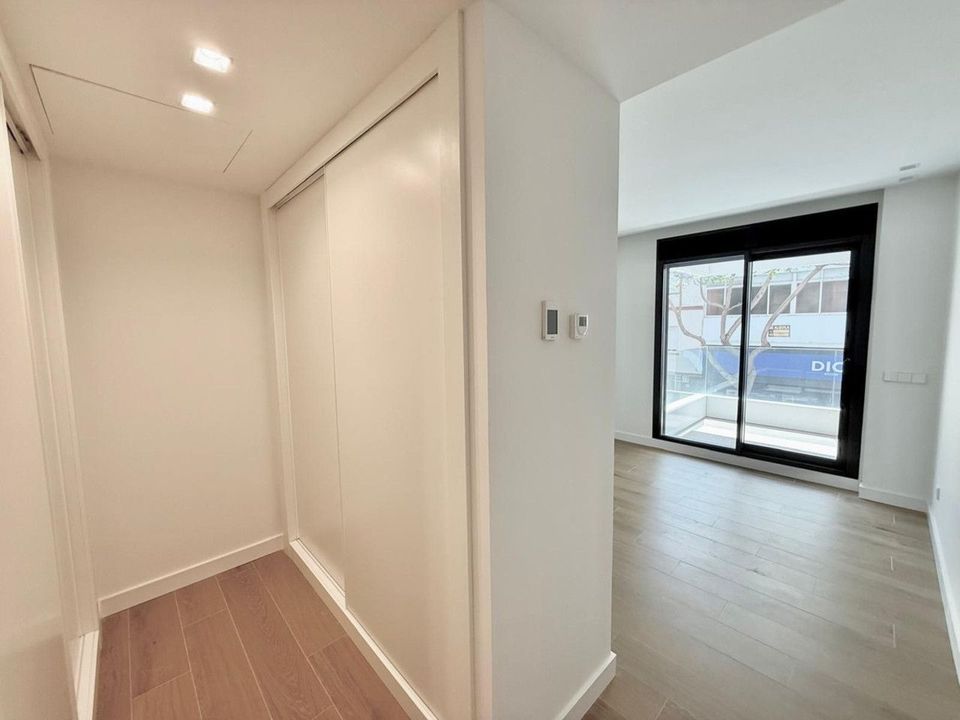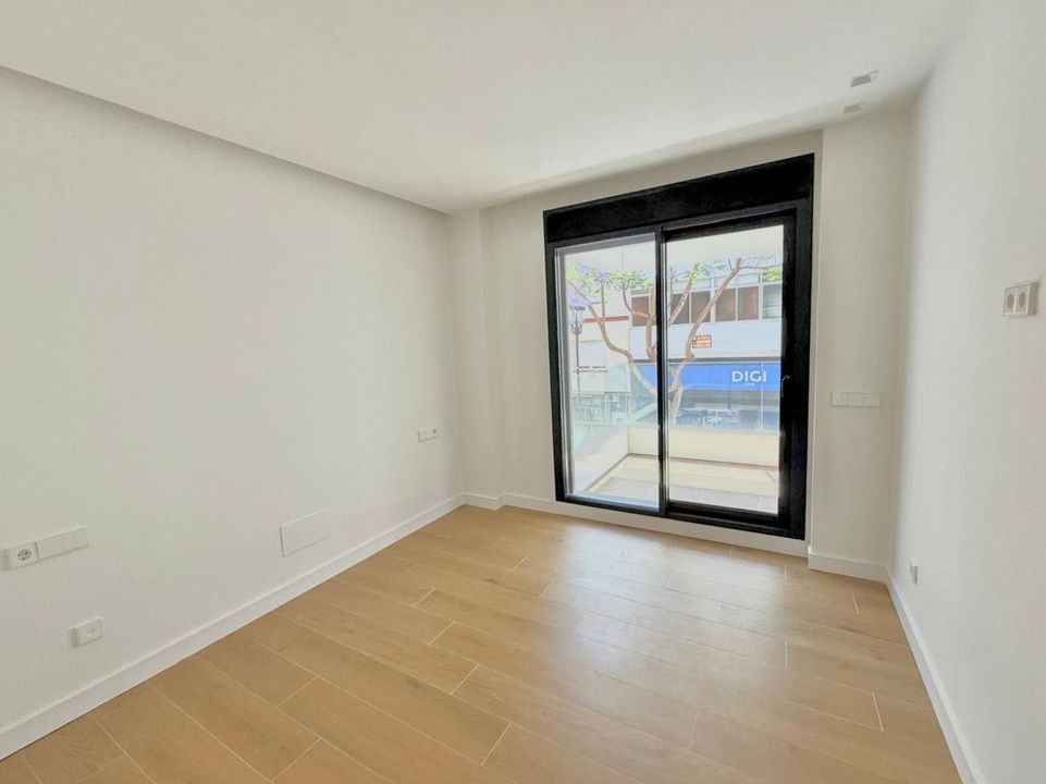 The bright and expansive living-dining area opens onto one of the two private terraces, perfect for enjoying the Mediterranean climate year-round. The apartment includes three bedrooms: the master suite features a walk-in wardrobe and en-suite bathroom, while the other two bedrooms have access to the rear terrace and come with fully fitted built-in wardrobes. There is also a second large, modern bathroom.