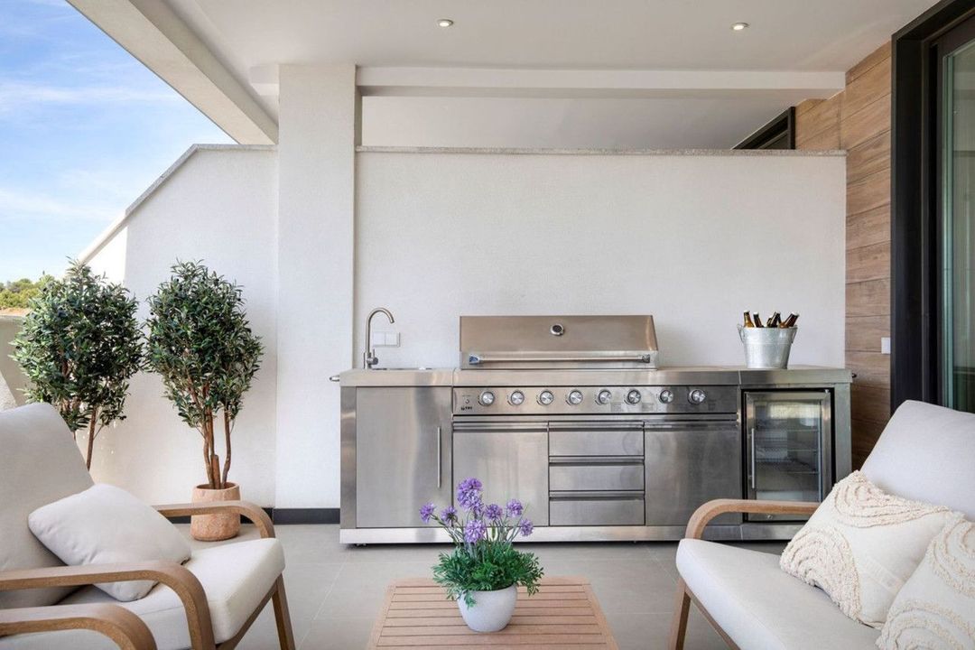 The property offers 132 m² built (102 m² usable) and an exceptional 84 m² terrace with a fully equipped outdoor kitchen. More than just a terrace, it is a true outdoor living space for year-round use. From here, there is a small glimpse of the sea, but above all open views across the valley, creating a strong sense of space, light and privacy.