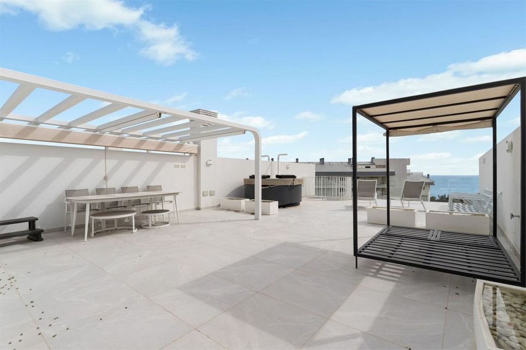 The property has a modern style and offers two bedrooms and two bathrooms, one of which is en-suite. The open kitchen and living room create a spacious and inviting atmosphere. Through the sliding doors, we access a southwest-facing terrace of 22 sqm with an impressive view of the Mediterranean Sea. Additionally, there is a rooftop terrace of 107 sqm with an installed jacuzzi, perfect for relaxation.