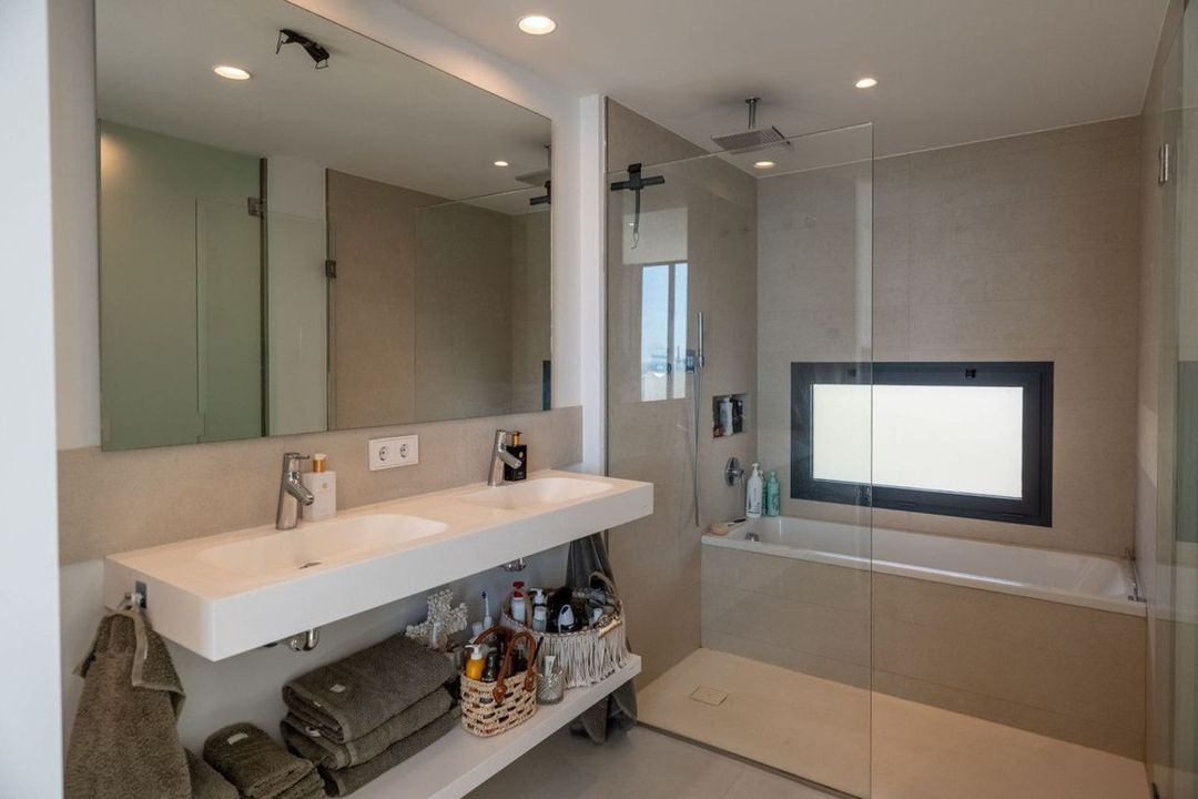 To the right of the entrance, the private quarters offer three serene bedrooms and two bathrooms benefiting from comfortable underfloor heating. The luxurious main bedroom features a walk-in closet, a spacious en-suite bathroom, and direct sliding-door access to the main terrace. Two additional guest rooms, complete with built-in wardrobes, share a well-appointed second bathroom.