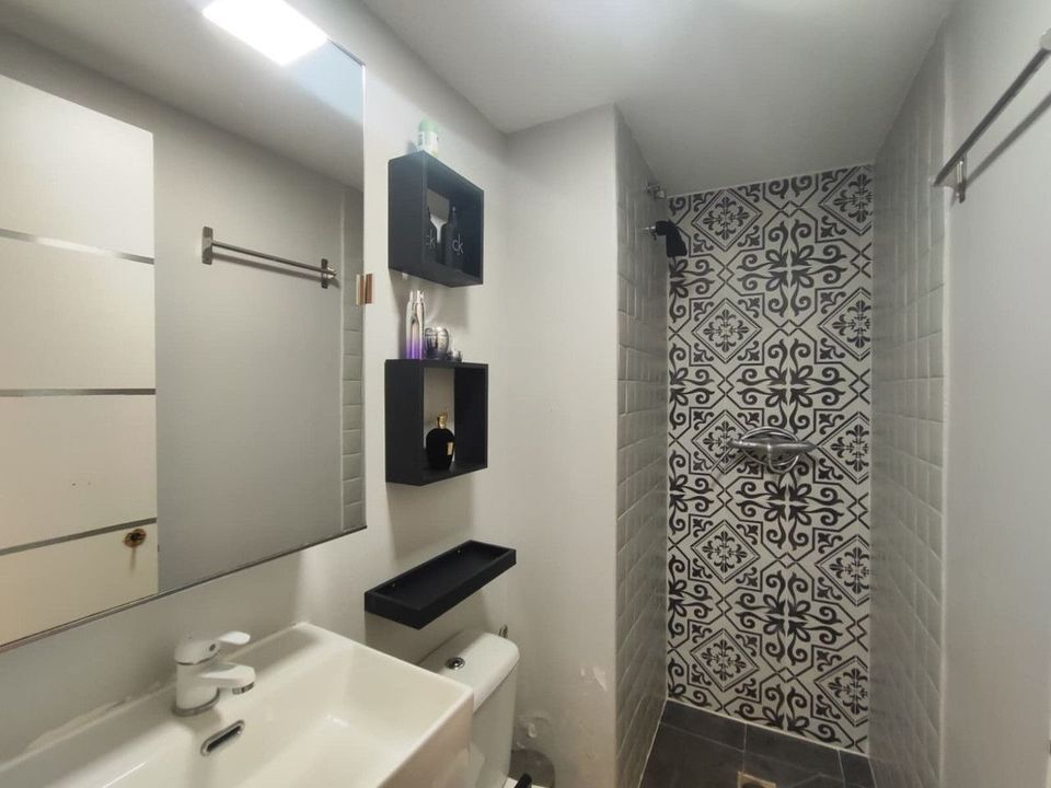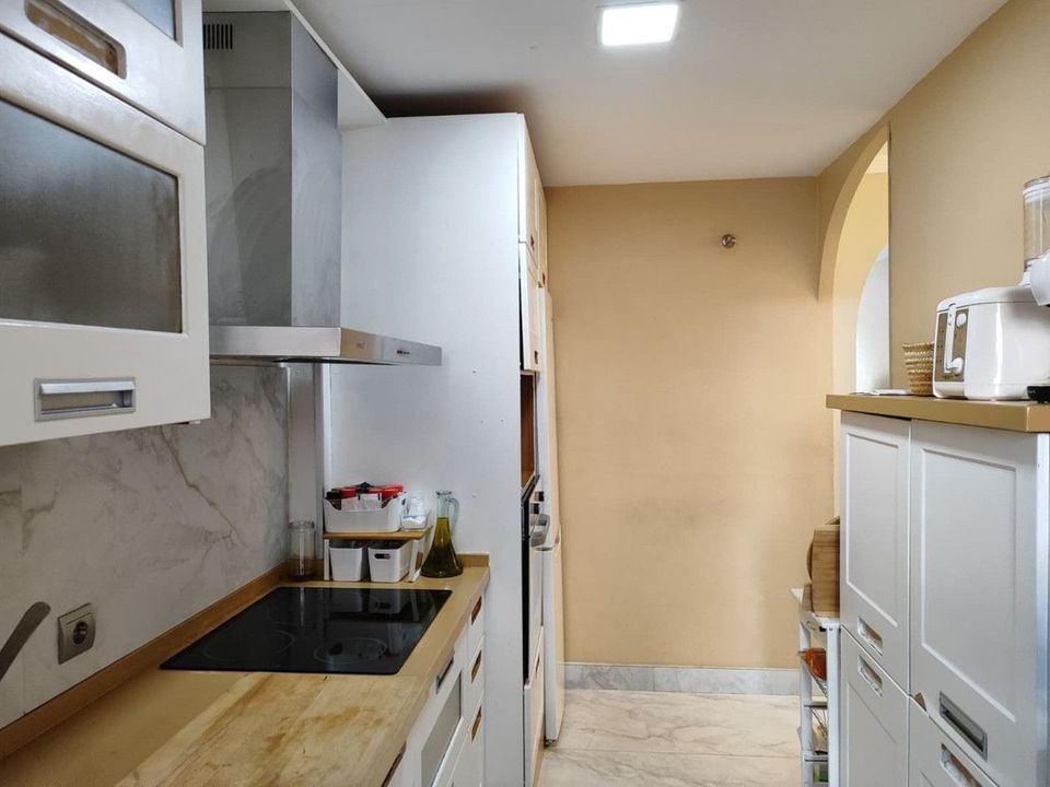 It features a very bright living room with access to a terrace, a fully renovated independent kitchen with utility room, and a convenient guest bathroom with a walk-in shower.