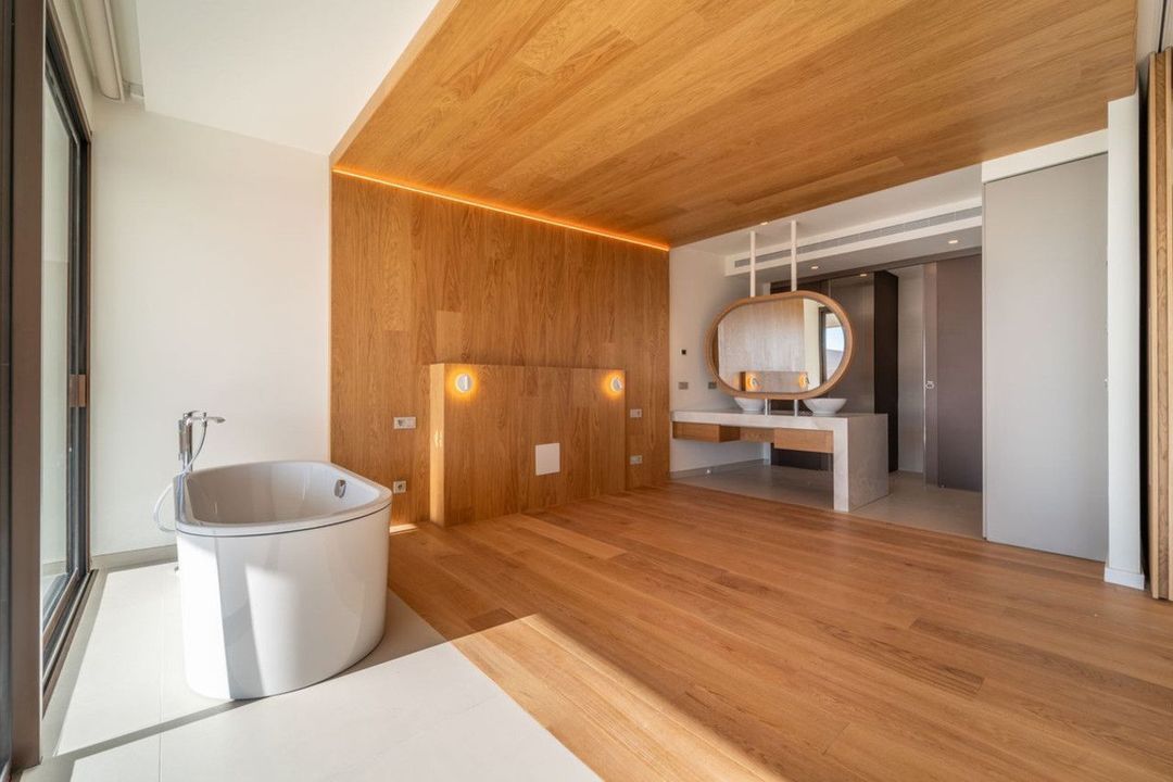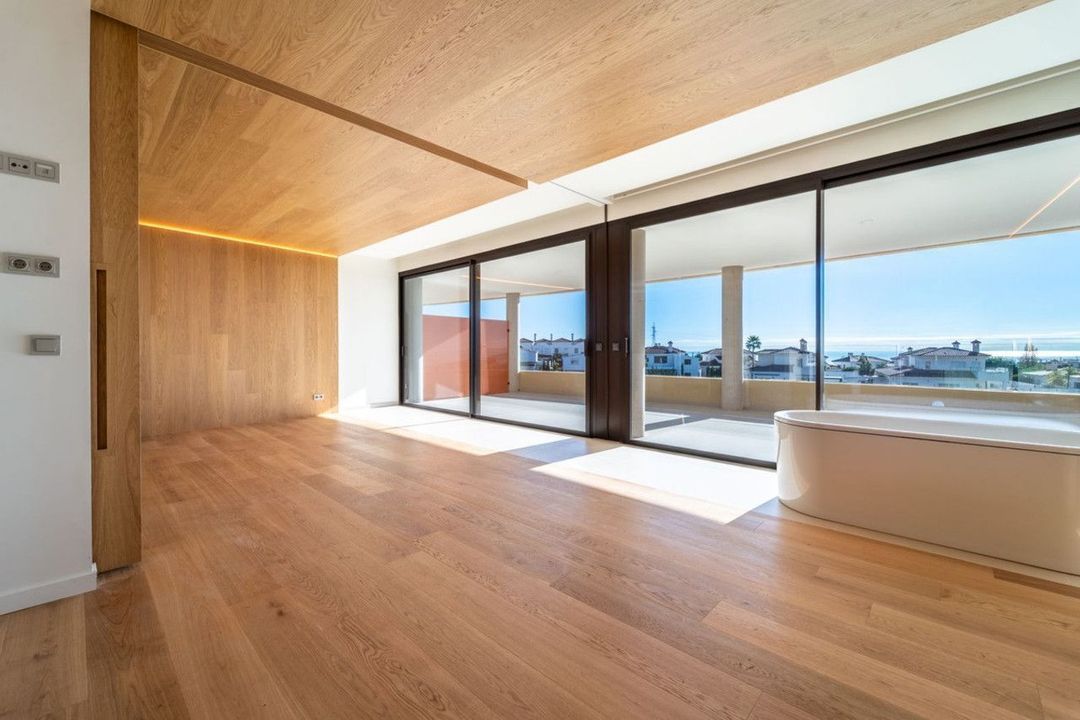 Main bedroom with ensuite bathroom and walk-in closet. This apartment is distinguished by the ingenious movable wall that connects the master bedroom-suite to the living room. This elongated sliding door is designed to duplicate the entrance of natural light and enjoying much better views. This easy interaction between the living spaces creates a flexible open area that is designed for you to enjoy the climate and lifestyle of Southern Spain. This clever design not only maximises the natural light of the Costa del Sol in both rooms, but also allows you to admire the splendid views from every corner of your home. Air conditioning hot and cold, video intercom, domotic system, pre-installation alarm system, water filter system, under floor heating in both bedrooms and bathrooms. Includes two parking spaces (one with electric car charger) and one storage room.