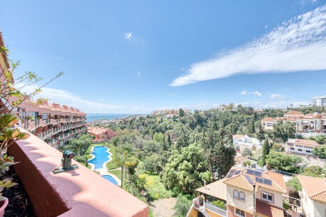 Set over two generous levels, this standout duplex penthouse offers a rare blend of elevated views, natural light, and versatile indoor-outdoor living, all within a quiet and secure community in Torreblanca. Whether you're seeking a stylish full-time residence or a quality holiday escape, this property delivers the space, setting, and lifestyle you've been looking for. The main level welcomes you with a bright, open-plan living area featuring a fireplace and direct access to a large covered terrace boasting uninterrupted views of the sea, mountains, swimming pool, and port of Fuengirola. A separate, fully equipped kitchen offers functionality and flow, while an additional room on this level can serve as either a guest bedroom or home office, conveniently served by a full bathroom with walk-in shower. Upstairs, a private hallway connects two spacious sized double bedrooms, each with built-in wardrobes and access to two open terraces that capture 360º views of the surroundings, with complete privacy. The primary suite includes an en-suite bathroom with bathtub, while the second bathroom is perfect for guests or family.