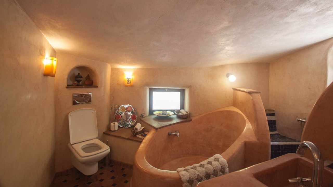 This open-plan kitchen connects via a staircase to the first floor, with a master bedroom and a bathroom, both in Moorish style, a further two bedrooms, a laundry area and a storage area for the weaving mill, again this area could be repurposed for accommodation.