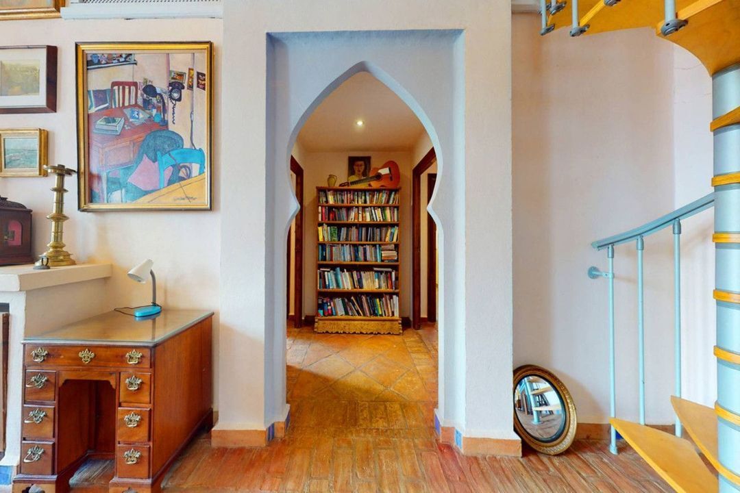 Step through the grand antique wooden doors into a majestic entry hall, where timeless elegance beckons. The sprawling double-height living room, adorned with Moorish arches, brick pillars, and original tiling, evokes a sense of old-world opulence. Flooded with natural light, this central hub seamlessly blends distinct living areas, including a cozy lounge with a roaring fireplace, an intimate dining area, and a tranquil music or study corner. Throw open the French window doors and step onto the terrace, where captivating vistas await.