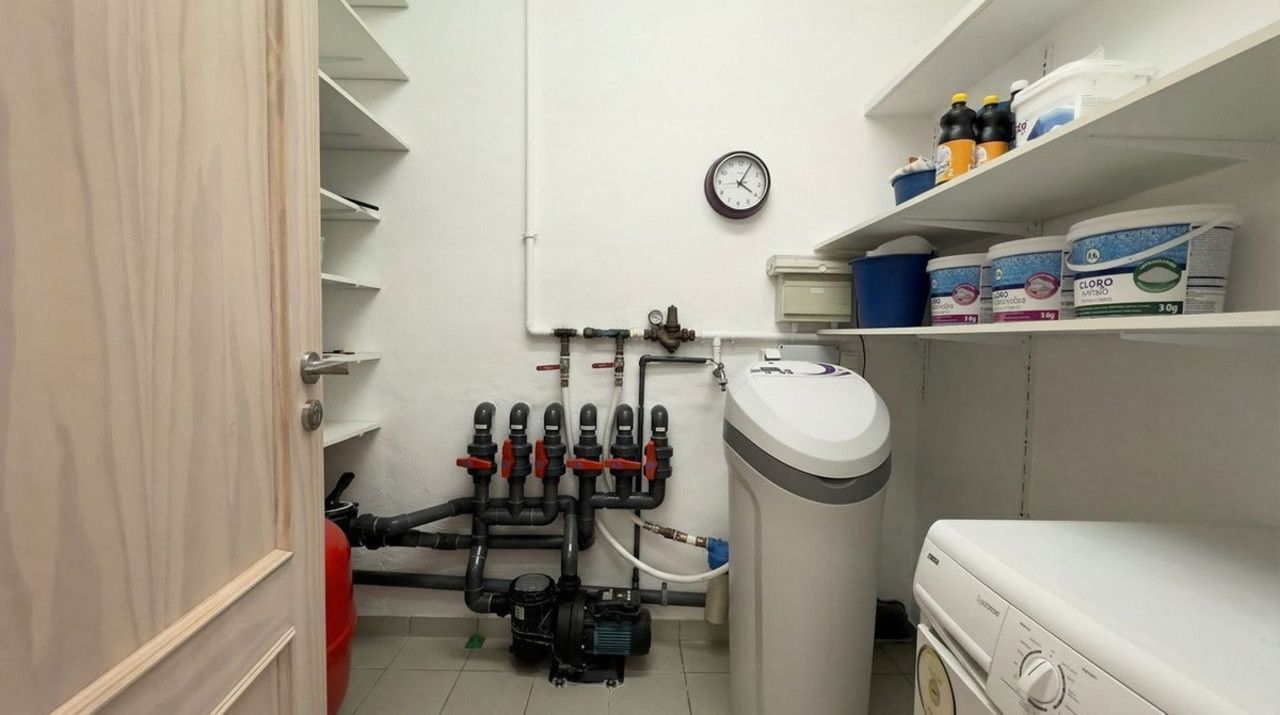 Een marmeren trap leidt naar de benedenverdieping. Hier vindt u een gastenappartement met en-suite badkamer en een eigen ruime keuken. Naast het gastenverblijf, via de enorme garage (55 m²!), bevindt zich een vierde slaapkamer die ook als kantoor kan dienen. Tevens bevinden zich op deze verdieping de technische ruimte (met zwembadpomp) en een opslag-/werkruimte van 30 m². Gezien de beschikbare ruimte en de aanwezige aansluitingen biedt deze verdieping volop mogelijkheden om 2 of 3 extra gastenkamers te creëren — ideaal voor het starten van een B&B.