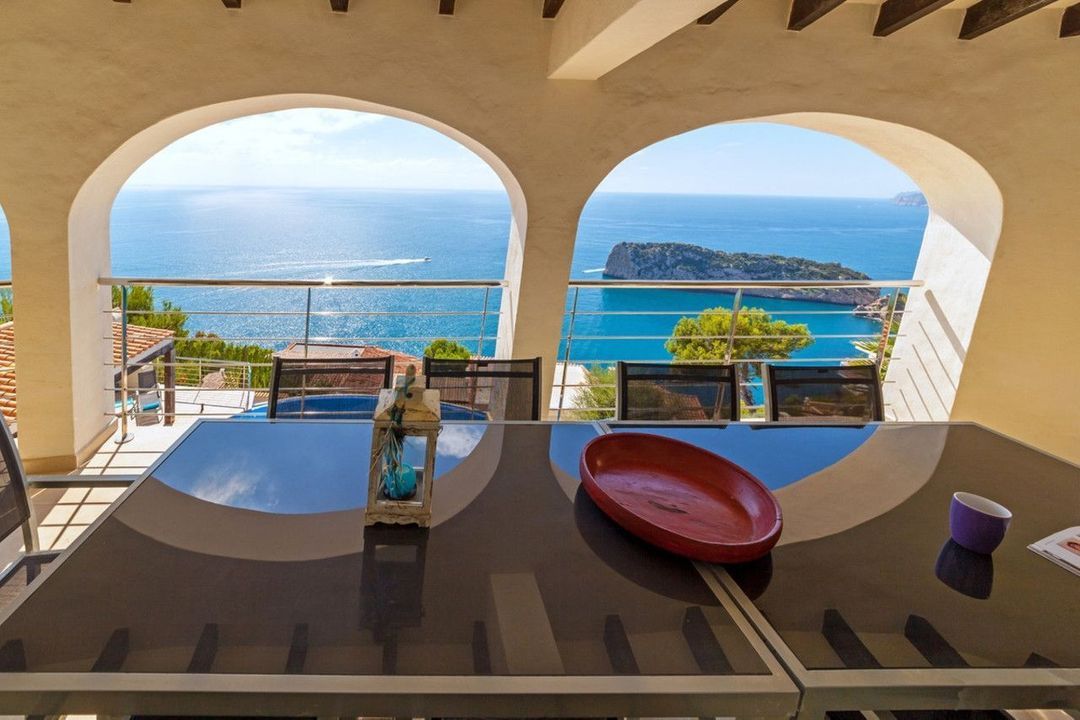 This impressive 6 bed 4 bath villa is located in a quiet area close to Cabo De la Nao, Javea. The sea views are incredible throughout the villa and while it is not situated on the first line, you would think you are from the majority of the villa.The property is entered either by a pedestrian gate or an electric sliding vehicle gate to a single car parking area. once through the front door and a short hallway you enter the living room where your gaze is drawn to the sea views in front of you. The large lounge gives access to the kitchen, dining room and the covered dining terrace. there is also access via a short hallway to three bedrooms, a double and a twin which share a bathroom and a master bedroom with ensuite bathroom where you can lie in bed and admire the sea views. From the living room, there is a staircase up to a circular tv room and then up to a roof terrace offering unbeatable views. Another staircase leads to the lower level which comprises an open plan living/dining/kitchen area from which you can access another covered dining/sitting area, and also another three bedrooms, two of which share a bathroom while the other, which also offers fantastic sea views, has an ensuite bathroom.From the lower covered terrace there is access to the parking area, and also down a few stairs to the pool terrace where again the sea views are incredible. To one side of the infinity pool area is a covered sitting/dining area complete with built in BBQ, while to the other is a built in Jacuzzi and all around is plenty of space for sunbeds.This is a property which demands to be viewed to appreciate how good the sea views are, and all the benefits offered by the villa.