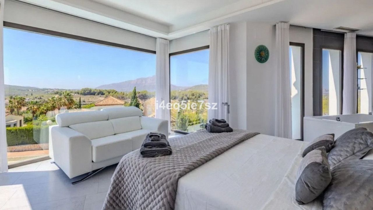Stap in een wereld van verfijnde verfijning met vijf weelderige suites, elk een privéheiligdom van verwennerij, compleet met prachtige afwerkingen en adembenemende uitzichten. De uitgestrekte open woonkamer baadt in natuurlijk licht en loopt naadloos over in panoramische terrassen met een adembenemend uitzicht op de Middellandse Zee en de majestueuze berg Montgó.