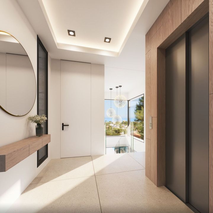 De hoofdingang geeft directe toegang tot de eerste verdieping en een lift voor vier personen verbindt alle drie niveaus.