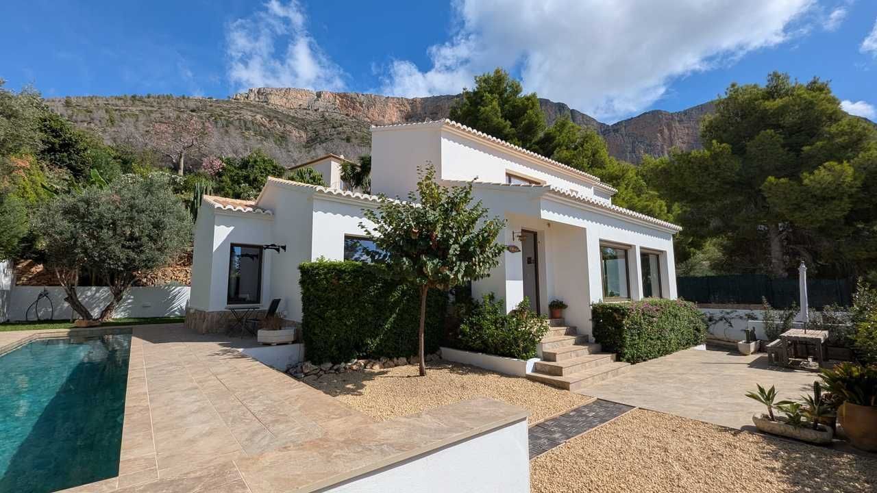 Renovated, high-quality 3 bedroom Mediterranean-style villa, for sale perfectly positioned in the prestigious Ermita-Montgó area of Jávea. Nestled beside the Montgó Natural Park, it enjoys sweeping valley views and a rare sense of peace and privacy. The property is distributed over 2 floors and has been sympathetically reformed to combine modernity and traditional charm. Entry to the property is via an electric gate into a large parking area with a single garage off this, giving space for 2 or 3 vehicles. A few steps lead to the front door which then leads into the kitchen/living/dining area with a bright open-plan layout with high ceilings and expansive double-glazed windows that flood the home with natural light. At its heart, a contemporary kitchen, with high-quality equipment, flows seamlessly into the living and dining areas, extending out to the terraces for effortless indoor-outdoor living. From the living area, you can access the ground floor bedroom which the current owners use as a TV / living room. There is an office area and a family bedroom also on the ground floor. Internal stairs lead to the first floor which houses the master suite featuring a dressing room and panoramic valley views, with access to a bathroom shared with "Jack and Jill" access to Bedroom 2. Hot and cold air conditioning is available in the bedrooms and living area, underfloor heating, and solar panels provide year-round efficiency and sustainability. All the windows are Guardian Sun windows to improve thermal efficiency, security and sound insulation. The outdoor spaces are equally impressive, with a private swimming pool, a charming barbecue area, and Mediterranean-style landscaping designed for both leisure and low maintenance. A lovely garden, with lemon, avocado and orange trees, adds an authentic touch to the lifestyle this villa offers. Just minutes from Jávea’s historic old town, Denia, sandy beaches, golf courses, international schools, and the AP-7 motorway, the home combines seclusion with easy accessibility. Whether as a permanent residence, a luxurious holiday retreat, or a sound investment, it represents one of the finest opportunities on the Costa Blanca. Key Features: - Prestigious location in Ermita-Montgó, Jávea - Panoramic valley views - Recently renovated with premium finishes - 775m² private plot with Mediterranean landscaping - Bright open-plan layout with modern kitchen - 3 spacious bedrooms, including a master suite with dressing room - Storage (14,4m2) - Private swimming pool and outdoor entertaining areas - Energy-efficient with solar panels (A-rated certification) - Central air conditioning and underfloor heating - Close to beaches, golf, shops, and international schools Don’t miss this incredible opportunity to own a slice of paradise at the foot of the Montgó. AN EXCELLENT INVESTMENT OPPORTUNITY WITH GUARANTEED RENTAL INCOME AVAILALBE. Contact us today to arrange a private viewing.