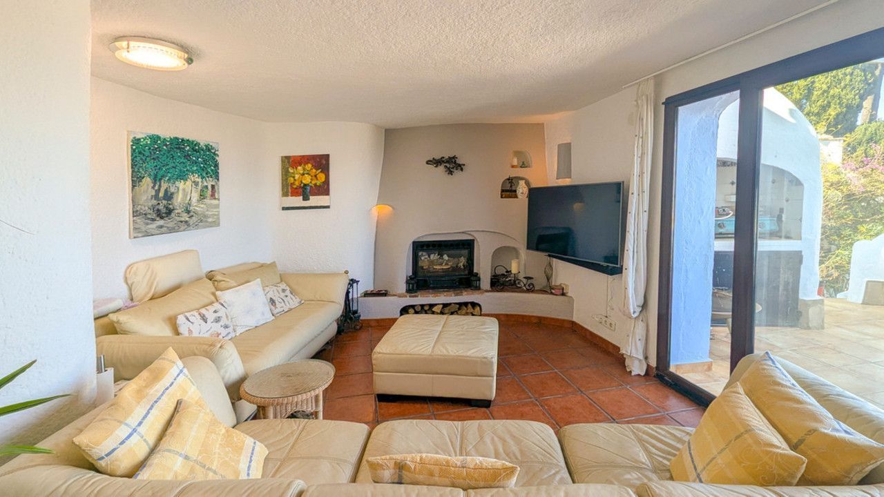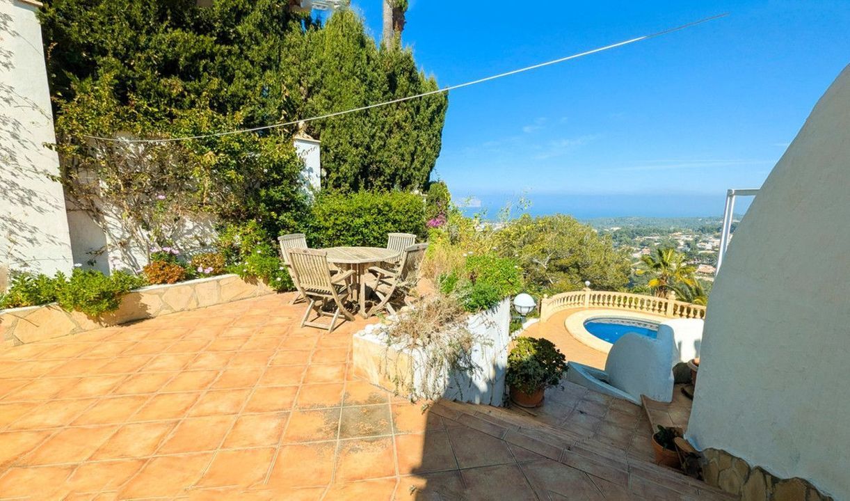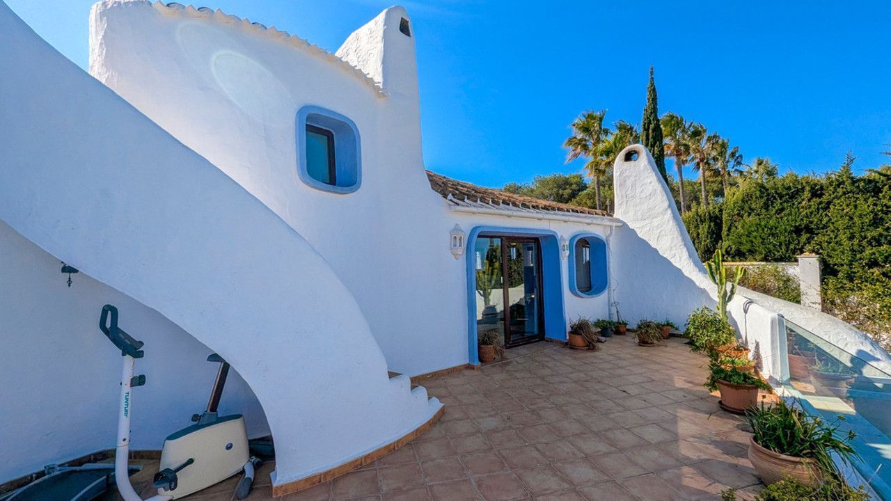 This 5 bed 3 bath house was designed by the well-known architect Manual Jorge and displays his usual features. Set in an elevated position and between two roads, this property offers sea views from nearly every room and every terrace of which there are several.The property is accessed by a pedestrian gate or vehicle gate to a parking space for two cars. To the left is a large terrace with sea views while to the right there is access to the top of the garden which spills down the right hand side of the property on all levels. Entering the property you arrive in a small landing with access to the large master bedroom to the left which offers access to a large terrace with views over Javea and also impressive sea views, while to the left of the hallway is a modern bathroom with jacuzzi style bath and also a shower, and then a bedroom or dressing room. Between the bathroom and bedroom/dressing room is another access to the large terrace. From this terrace there is a staircase to a good sized roof terrace. From the hallway there is a curved staircase to the middle level of the property.The staircase leads to a large living room with features typical of a Manuel Jorge design including a wood burning fireplace. There is access to a dining terrace and with a built in BBQ, and from here there is a staircase up to a side terrace and another staircase to the pool terrace and the bottom level of the property. From the living room you can access the large kitchen, and then a utility room. The Utility room has a external door to the garden, and also to another bedroom currently used as an office and also to the family shower room. Off the kitchen there is another door to the terrace and also a circular staircase to the lower level.Th staircase leads to a hallway which gives access to the garden, to a large bathroom with shower and circular bath and the two bedrooms. The first bedroom is a double bedroom while the second double bedroom is larger and gives access to the pool terrace and a 12 x 6 recently renovated pool and also to the side garden. There is a lot of space around the pool for sunbeds and from this terrace, a staircase leads to a lower terrace and steps to a gate that gives access to the lower road. On the lower road are doors to what is currently used as storage, but could be converted back to a garage very easily. The Mediterranean garden which is terraced to one side of the house has an irrigation system and offers natural beauty throughout the year and completes the experience of this house designed to enjoy.