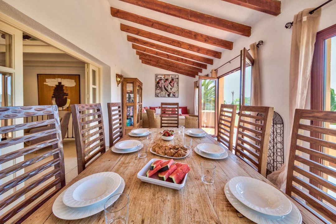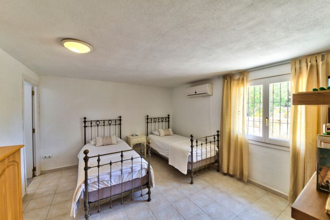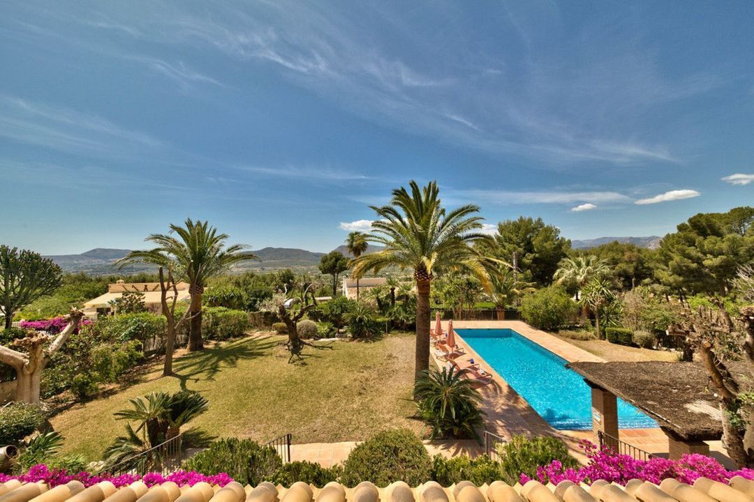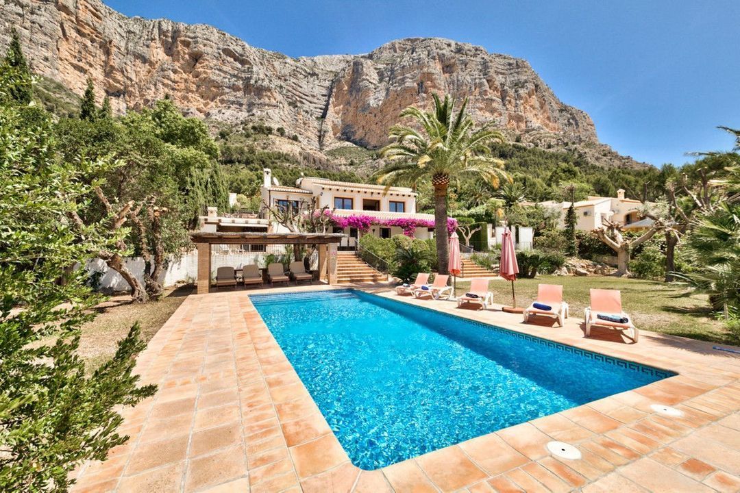 This impressive 5 bed 5 bath villa is set below the majestic Montgo mountain on the outskirts of Javea and boasts spectacular views across the valley and the surrounding hills. There are two driveways to choose from one leading to the upper level, and one to the lower level. The upper driveway has a carport and parking for several cars. A gate gives access to a small dining/seating terrace with spectacular Montgo views. The property is accessed via the well-equipped kitchen and onto a small hallway giving access to 2 large bedrooms, one with an ensuite, a twin room and 2 family bathrooms with walk in showers as well as the spacious living room complete with aircon, central heating and a fireplace. Off the living room there is a glazed Naya that looks across the valley with its spectacular views and has a seating area as well as a dining area, while at the rear of the lounge a staircase accesses the lower level.The lower level comprises a small second living room, and two further bedrooms, 1 large double with ensuite and another twin with ensuite. All the bedrooms on both levels have fitted wardrobes and air conditioning. Apart from the direct access to the second driveway. another door leads to lower covered terrace that offers both a seating area and space for a very large dining table. Adjacent to the terrace is a fully equipped summer kitchen with oven, hob, fridge freezer and a gas BBQ. There is also a walk-in shower and WC.A few stairs lead to the large lawned garden, the 12 x 4 heated pool and the shaded cabana with plenty of space for sun loungers which can be in sun or shade.