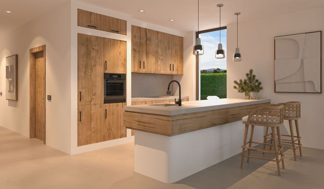 Met een smetteloze witte gevel en zacht afgeronde hoeken, wordt Villa Mila verfraaid door de natuurlijke schoonheid van handgesneden Montgó-stenen met warme rode tinten, die een authentiek mediterraan accent toevoegen. Binnenin beschikt de villa over microcementafwerkingen in de badkamers en door de hele vloer, harmonieus gecombineerd met dubbel beglaasde aluminium ramen in roestkleur, wat een perfecte balans biedt tussen luxe en comfort. De slaapkamers zijn uitgerust met elektrische rolluiken aan de buitenkant, terwijl de badkamers zijn voorzien van stijlvolle zwarte armaturen, die een moderne en verfijnde uitstraling geven.