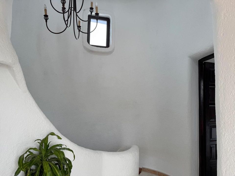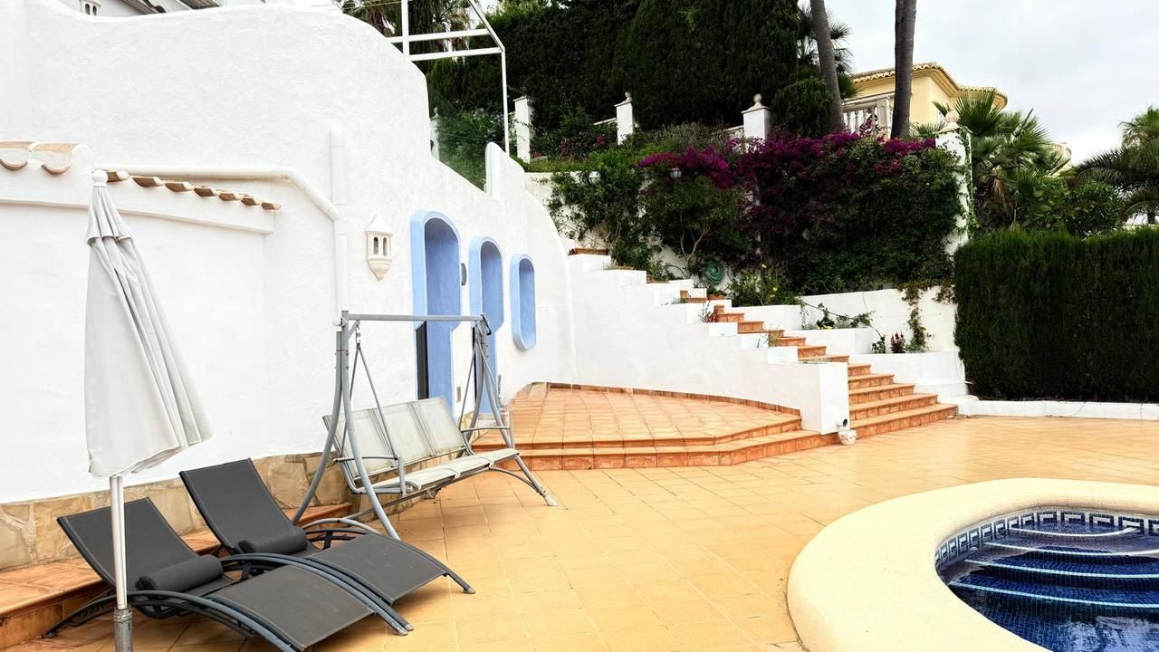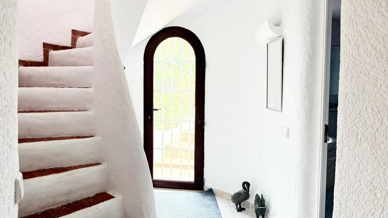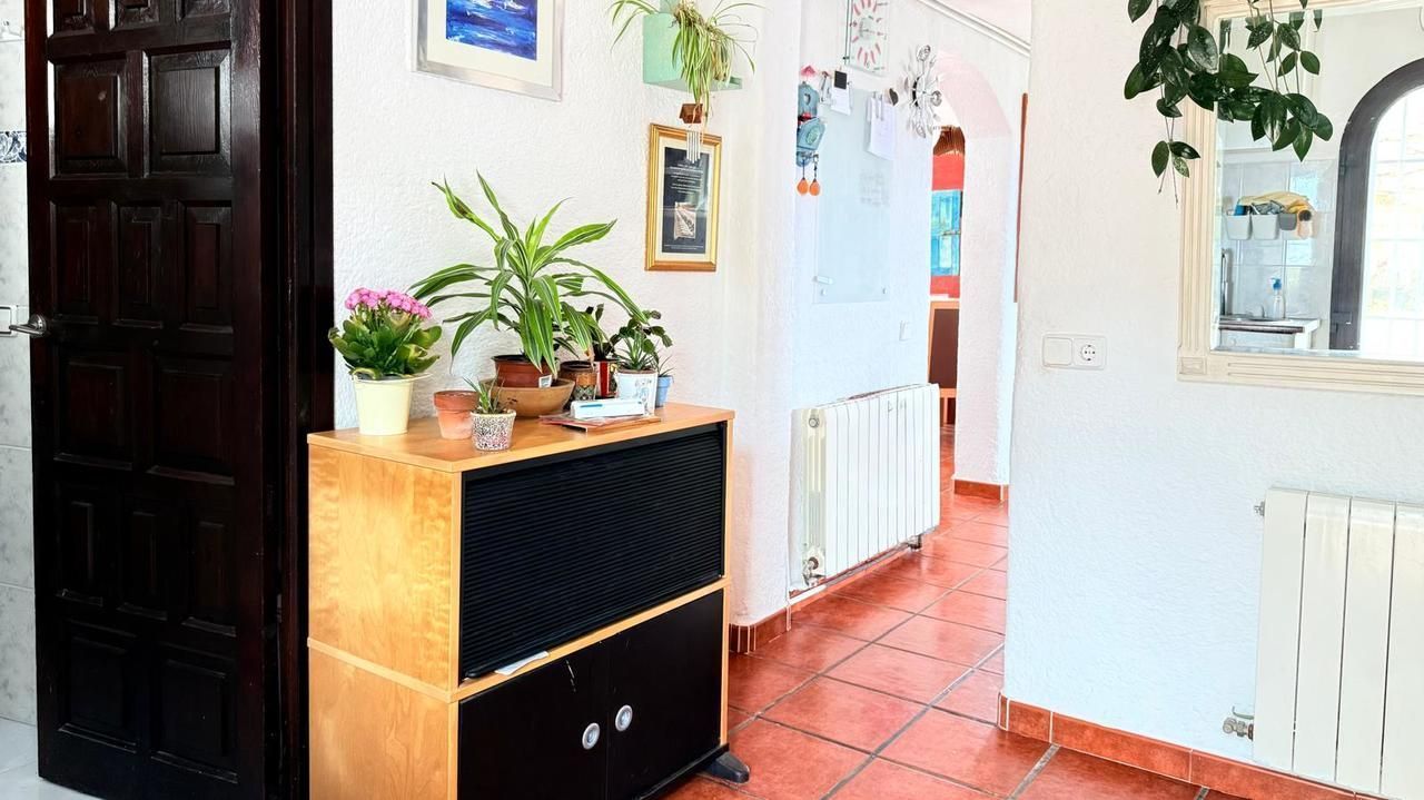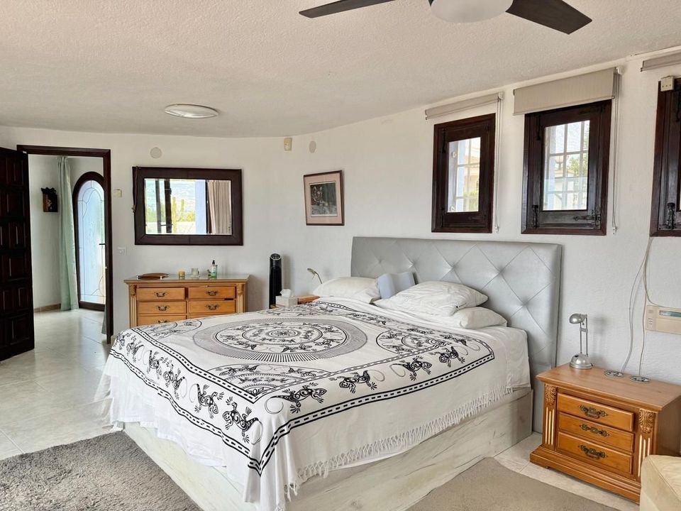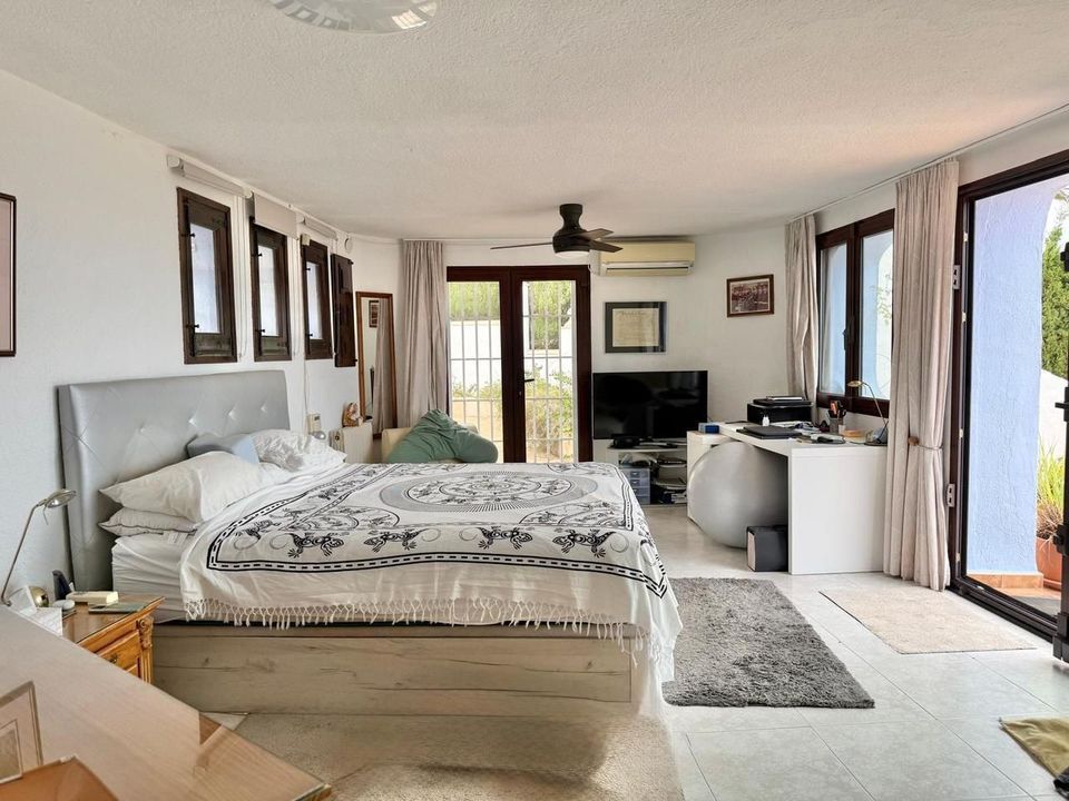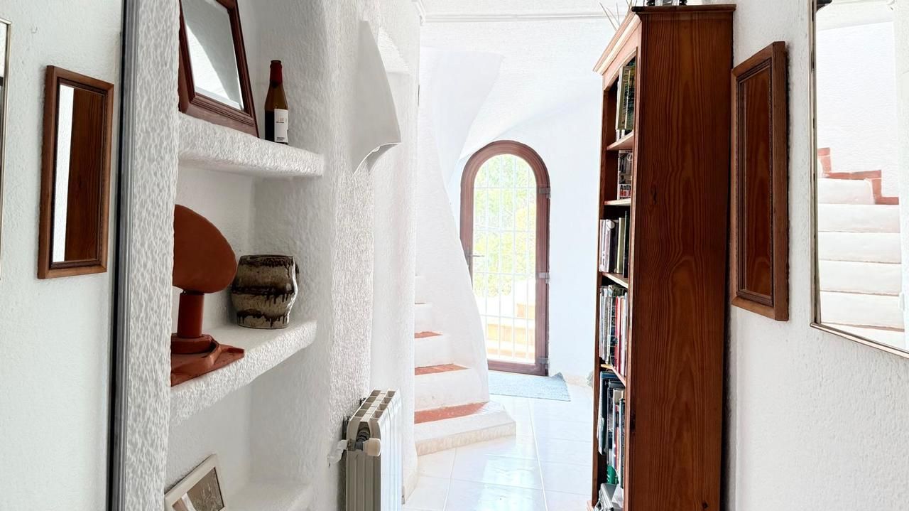 Vanaf de bovenste straat is de woning toegankelijk op een vlakke manier, met parkeergelegenheid voor twee voertuigen. Op deze verdieping bevindt zich de master bedroom, ruim en licht, met een groot privéterras vanwaar een indrukwekkend uitzicht op Jávea en de Middellandse Zee te genieten is. Op dezelfde verdieping is er een complete badkamer met een jacuzzi en douche, evenals een extra kamer (momenteel gebruikt als kleedkamer) met directe toegang tot het terras.