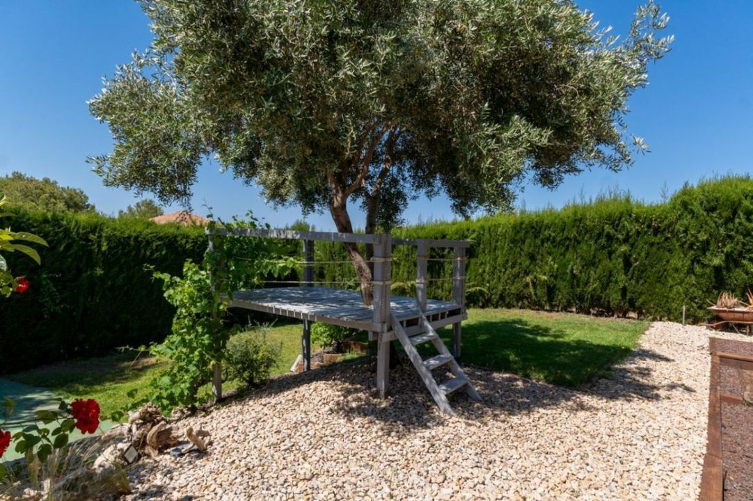 Op de hoofdverdieping vind je drie ruime slaapkamers, waaronder de mastersuite met eigen badkamer. De mooie en elegante woon-eetkamer, met hoge plafonds en houten balken, creëert een gezellige sfeer dankzij de open haard en de grote ramen die natuurlijk licht binnenlaten; naast de woon-eetkamer vind je een ruime overdekte terras, ideaal om buiten te eten terwijl je kijkt naar de tuin, het zwembad en het gras dat het huis omringt; vanuit de keuken is er ook een directe uitgang naar het terras, wat je ontbijten of maaltijden met vrienden of familie comfortabeler maakt.