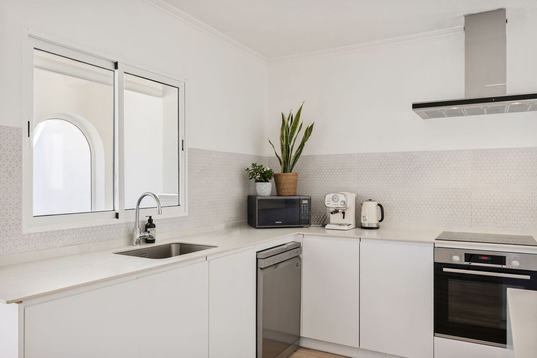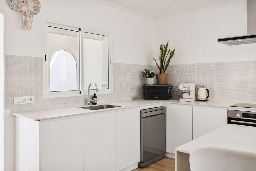 De keuken is op hoge hoogte afgewerkt met moderne apparaten en een centraal eiland dat is ontworpen voor zowel koken als informele bijeenkomsten. Vanaf hier is er toegang tot een extra dakterraseen ideale plek om te genieten van het open uitzicht of de avondzonsondergang.