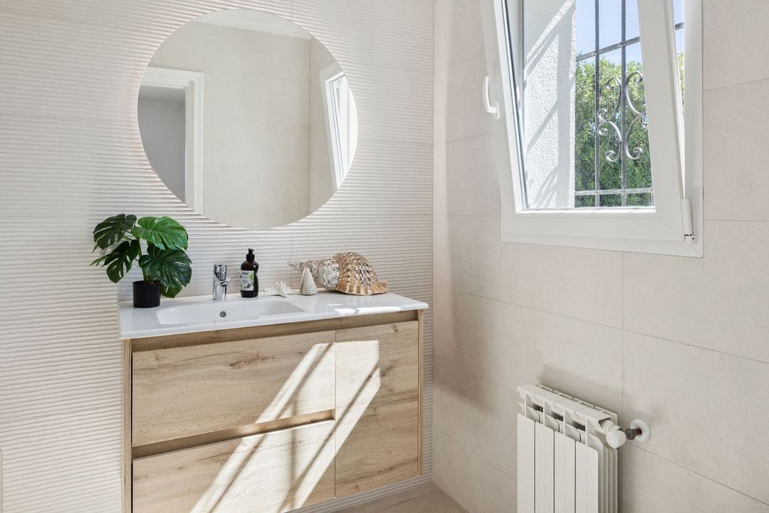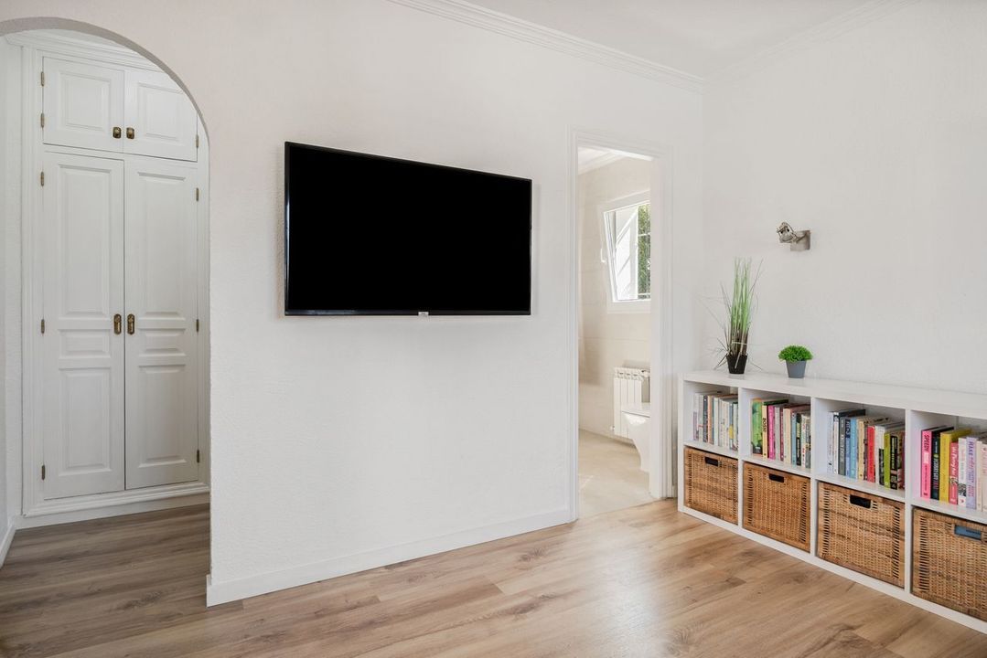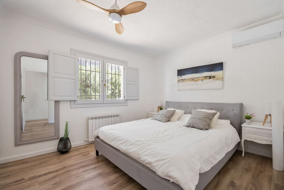 Buiten leven staat hier centraal. Het uitgestrekte terras omringt een groot privézwembad en biedt meerdere plekken om te ontspannen, dineren en te vermaken. Of je nu geniet van lange lunches in het schaduwrijke eetgedeelte of ontspant bij het zwembad, de omgeving wordt verrijkt door het weidse uitzicht op de Montgó-berg en het omliggende platteland. Een aparte buitenbadkamer zorgt voor het gemak bij het zwembad.