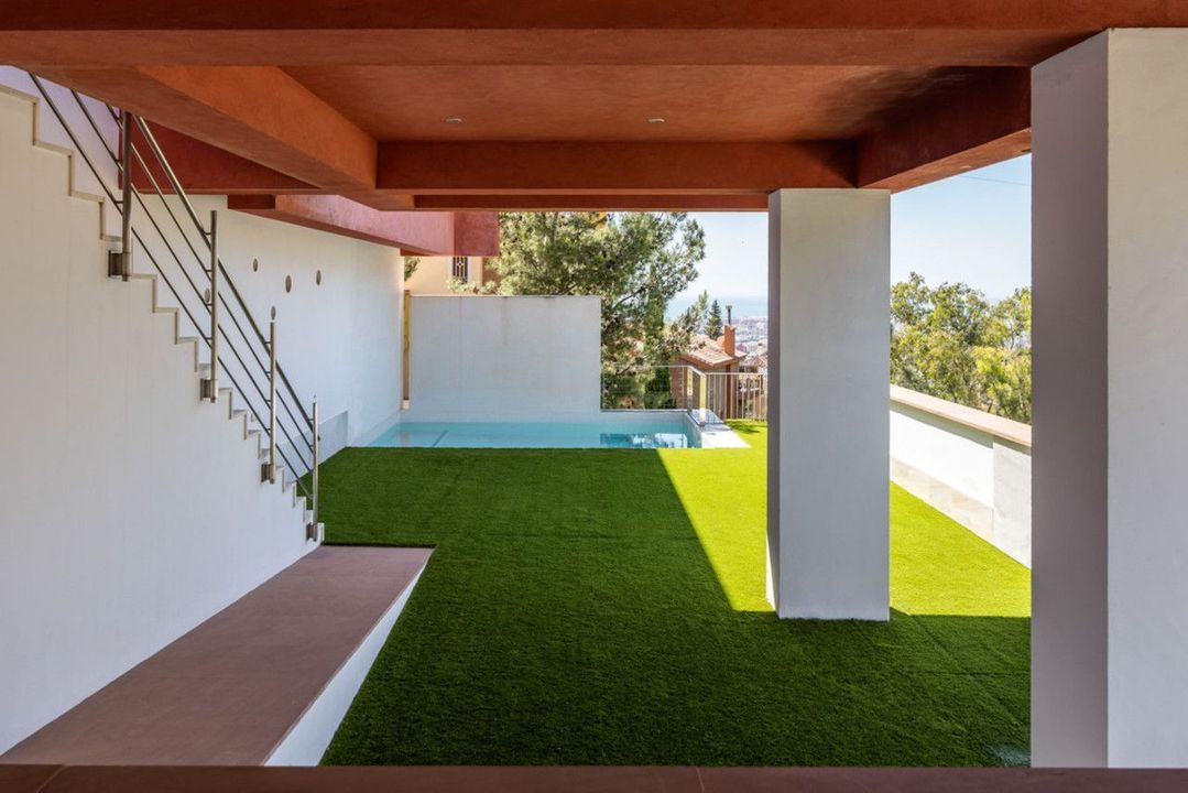 De buitenruimtes vormen het ideale decor om te genieten van het mediterrane klimaat, met een strak ontworpen zwembad omringd door terrassen en aangelegde tuinzones. Verschillende niveaus zijn verbonden via trappen en looppaden, wat zorgt voor een dynamische structuur met intieme buitenhoeken. De tuin combineert inheemse beplanting met hoogwaardige afwerkingen en zoekt de balans tussen esthetiek en duurzaamheid. Dit alles is ingebed in een rustige, besloten omgeving met ideale zonoriëntatie en zicht op de natuurlijke omgeving.